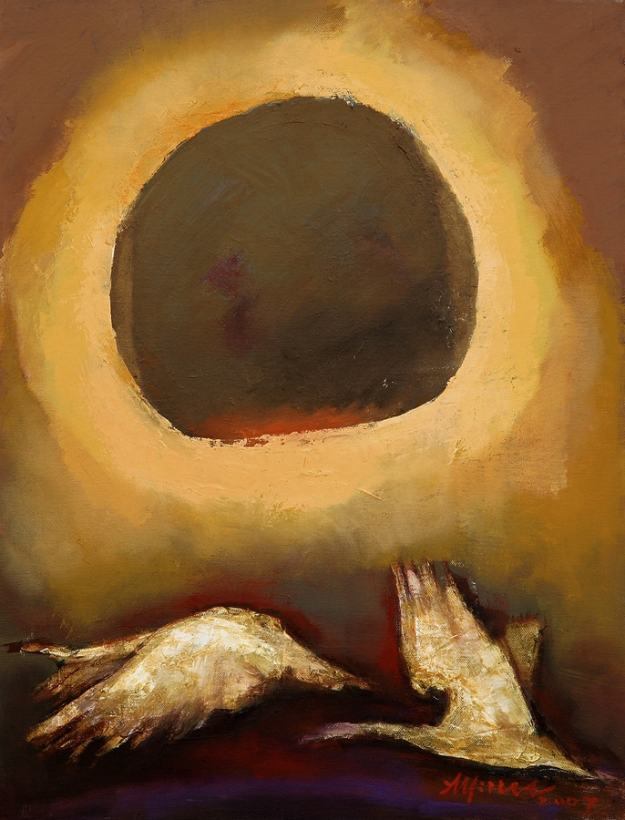 그 흑태양의 부제 중 하나가 비상 飛翔이다. 꺾여 있고 움츠러들었던 나래를 펼쳐 힘차게 솟아올라 미래를 향해 나아가는 자아의 상징이다. 화폭이 어두운 듯하지만, 그 내면의 모습은 너무나 밝은 광명의 세상이다. 짙은 흑색의 바탕에 어두운 빛의 태양은 마음속의 암울함을 이야기하지만, 그 암울함을 밝은 곳으로 이끌기 위한 듯 한 점의 붉은색과 한 무리의 밝은 황백의 빛줄기가 태양을 감싼다. 그 빛이 곧 내 마음의 어둠을 광명으로 이끄는 희망이다.