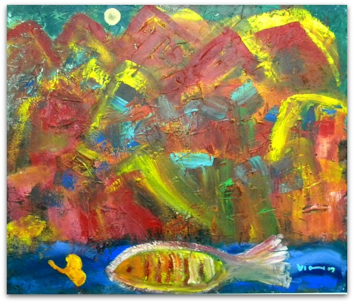 커다란 물고기는 그 힘의 의지를 보여준다. 힘찬 에너를 얻어 생명이 존재함을 에너지 가득한 공간임을 보여준다, 작품 자체가 주는 밝고 활기찬 이미지는 바로 이 높은 산과 대조되듯 아래쪽에 놓인 물고기의 움직임에서 드러난다.