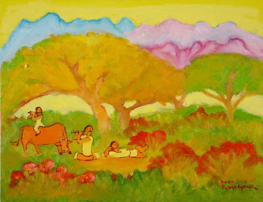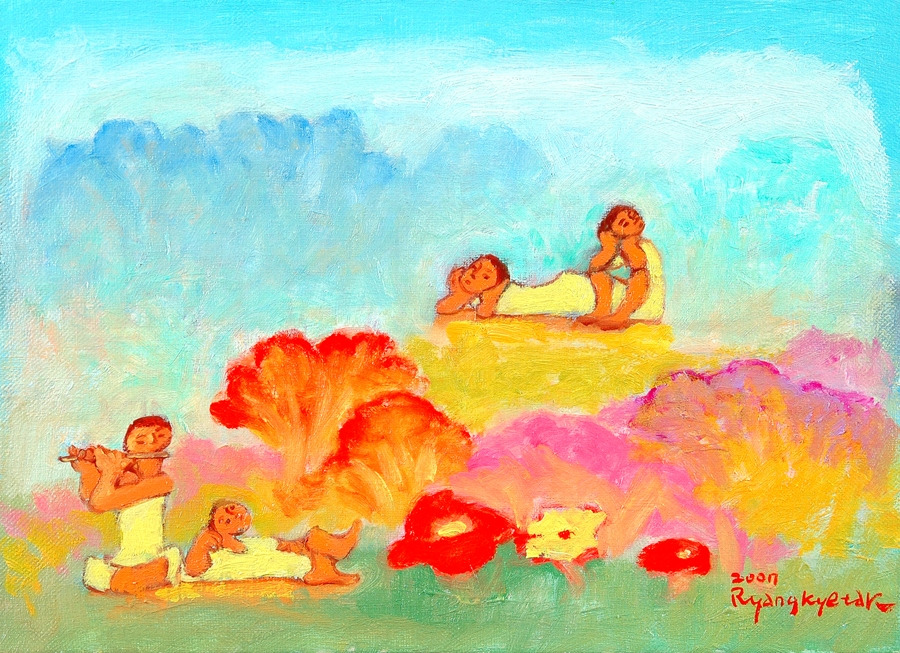 현실 속에서 찾아오는 순간순간의 부딪치는 문제에서 벗어나 마음의 안식을 취할 수 있는 공간을 그리워하는 피난처다. 바라보는 것만으로도 평화로운 공간, 그 속에서 나도 팔베개하고 드러누워 피리소리를 들으며 세상을 잊고 싶은 마음이다. 바라보는 것만으로도 나는 그림 속으로 들어갈 수 있지 않을까. 그 속에서 영생을 찾는다. 삶 속에 존재하는 피안의 공간, 휴식처다. 잠시 마음을 놓는 공간이다.