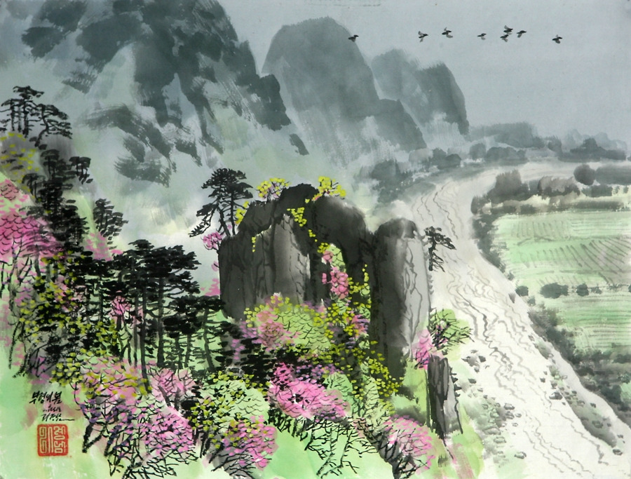 밭에는 이미 파릇파릇하게 풀들이 돋아나 있고 강물이 제법 흐르는 것을 보면 지난해 겨울에는 눈이 푸짐하게 내렸는가 보다. 올해는 풍년이 들 것이다. 유유히 흘러가는 강줄기가 마을을 감싸고 있어 곡식이 풍부하고 마을의 인심도 후할 것이다. 작가는 이런 산촌의 이미지를 봄이란 풍경을 통해 보여주는 듯하다