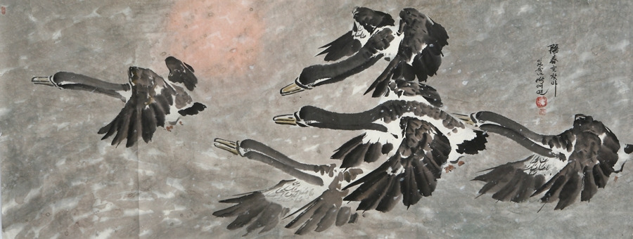 살아있는 것의 삶의 본능인가. 최적의 생활여건을 찾아 이역만리도 멀다 하지 않고 힘찬 날갯짓을 해대는 저 기러기의 군무. 이른 아침 눈발이 날리는 하늘을 바라보니 한 무리의 새들이 희미한 태양을 머리에 이고 하늘을 가로지른다. 작품은 회색 바탕 화면을 통해 기러기의 몸체를 더욱 부각하며 긴 시간의 흐름을 알려주고 있다. 결코 쉽지 않은 먼 행로에 대한 불안감과 의지도 드러내 보인다.