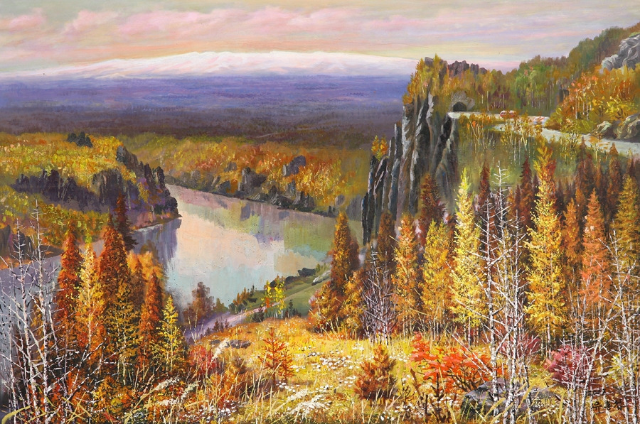 작가만의 독특한 화법으로 표현한 백두산은 그래서 더 아름답고 웅장해 보인다. 그의 사물 표현은 날카로운 듯 선명한 선으로 주제를 명확하게 드러내는 특성을 지녔다. 시원하게 쭉 뻗어 솟아오른 나무, 산과 하늘의 경계가 닿아있는 듯한 묘사와 가을 풍경의 화사한 모습이 비친 강물의 빛깔은 비단을 덮은 듯 영롱하다.