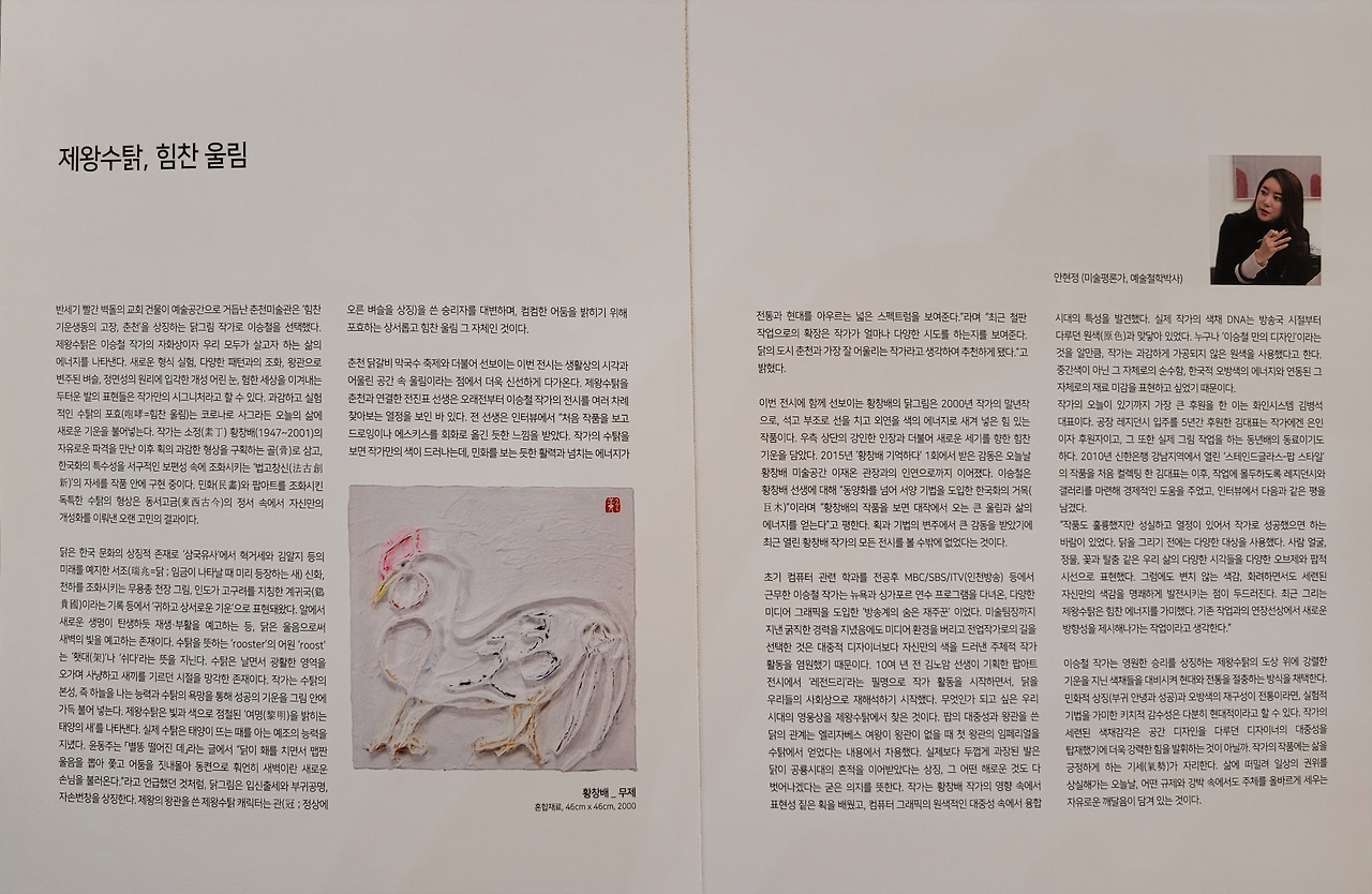 작가가 지닌 무한한 도전의식과 마음 한쪽에서 우러나는 진실이 모여 수탉은 날개 잃은 새가 아닌 봉황의 날개처럼 활짝 펴며 삶의 기운을 넣어주는 역할을 하는 것이다. 문헌 속의 다양한 닭의 귀한 존재처럼 그 위상이 낮지 않지만 현대에 다시 그 날개를 펼 수 있었던 것은 현대와 고전의 결합을 통한 변화의 한걸음을 내디뎠기 때문일 것이다.