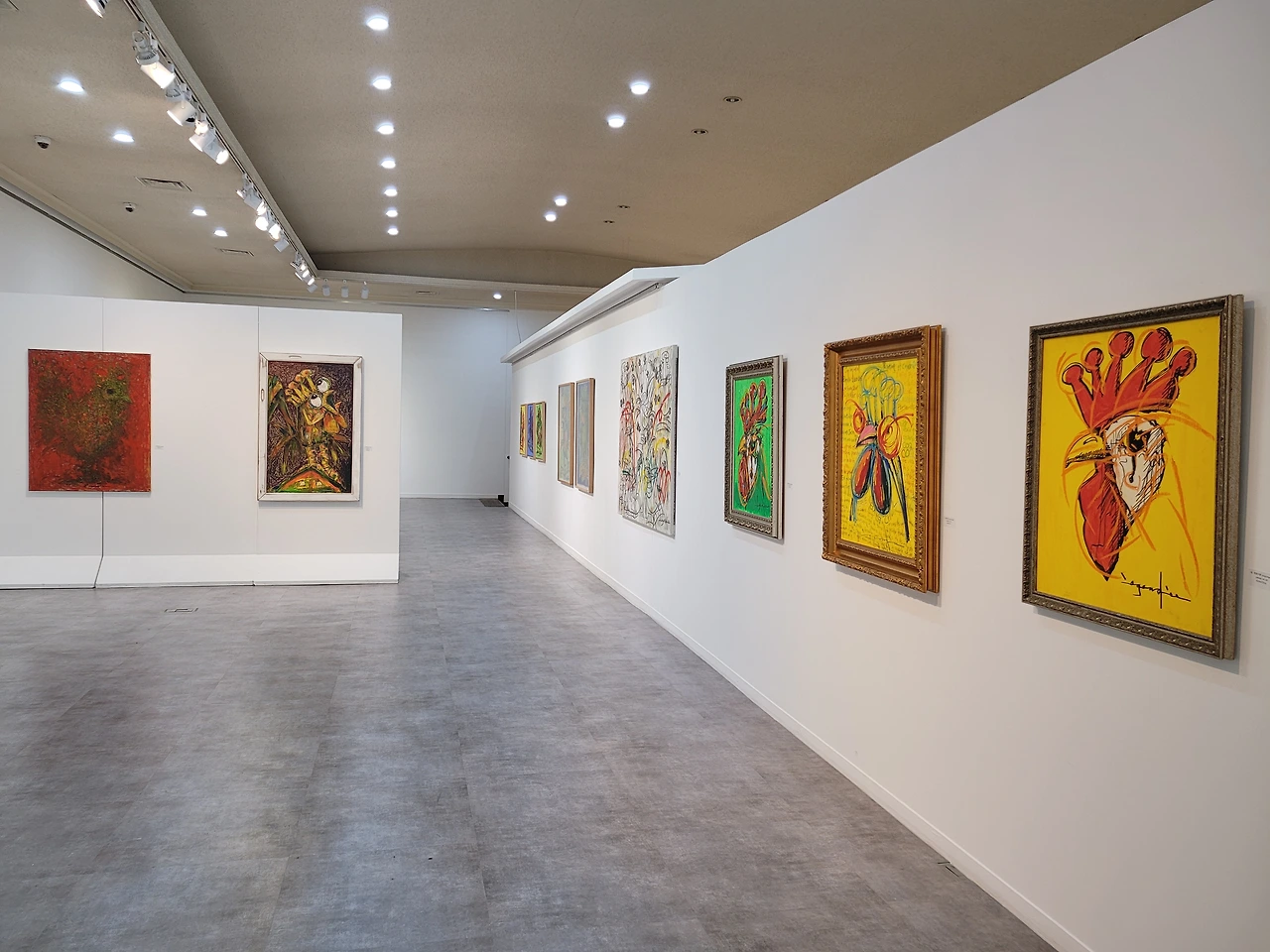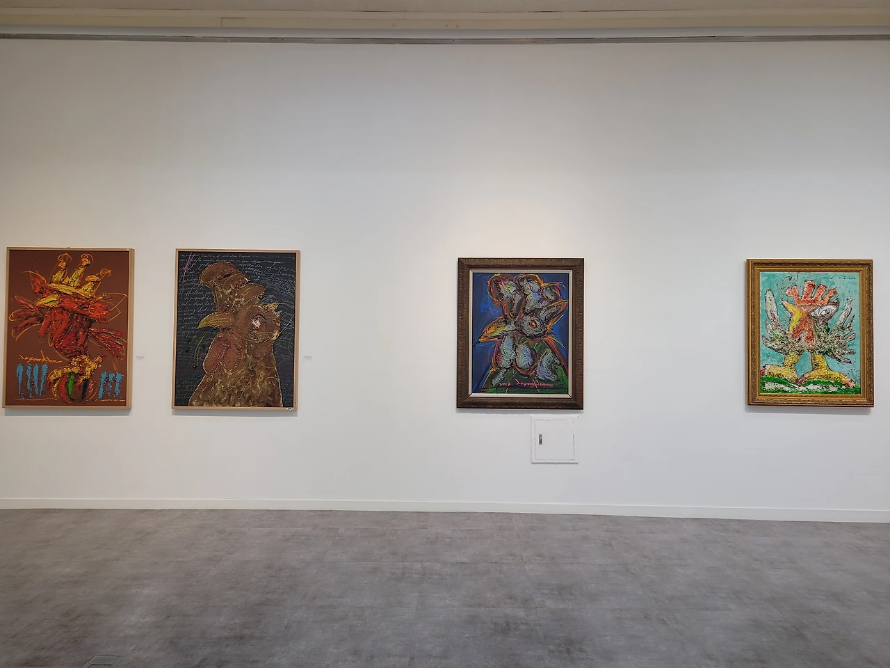 1, 2층으로 나누어진 전시공간은 1층에 대형 작품을 배치하여 웅장함과 작품의 방향성을 보게 하고, 2층에는 20~30호 작은 작품으로 수탉의 의미를 통한 작품 변화를 느낄 수 있도록 배치하여 작품을 관람하는데 이해를 돕게 한다.