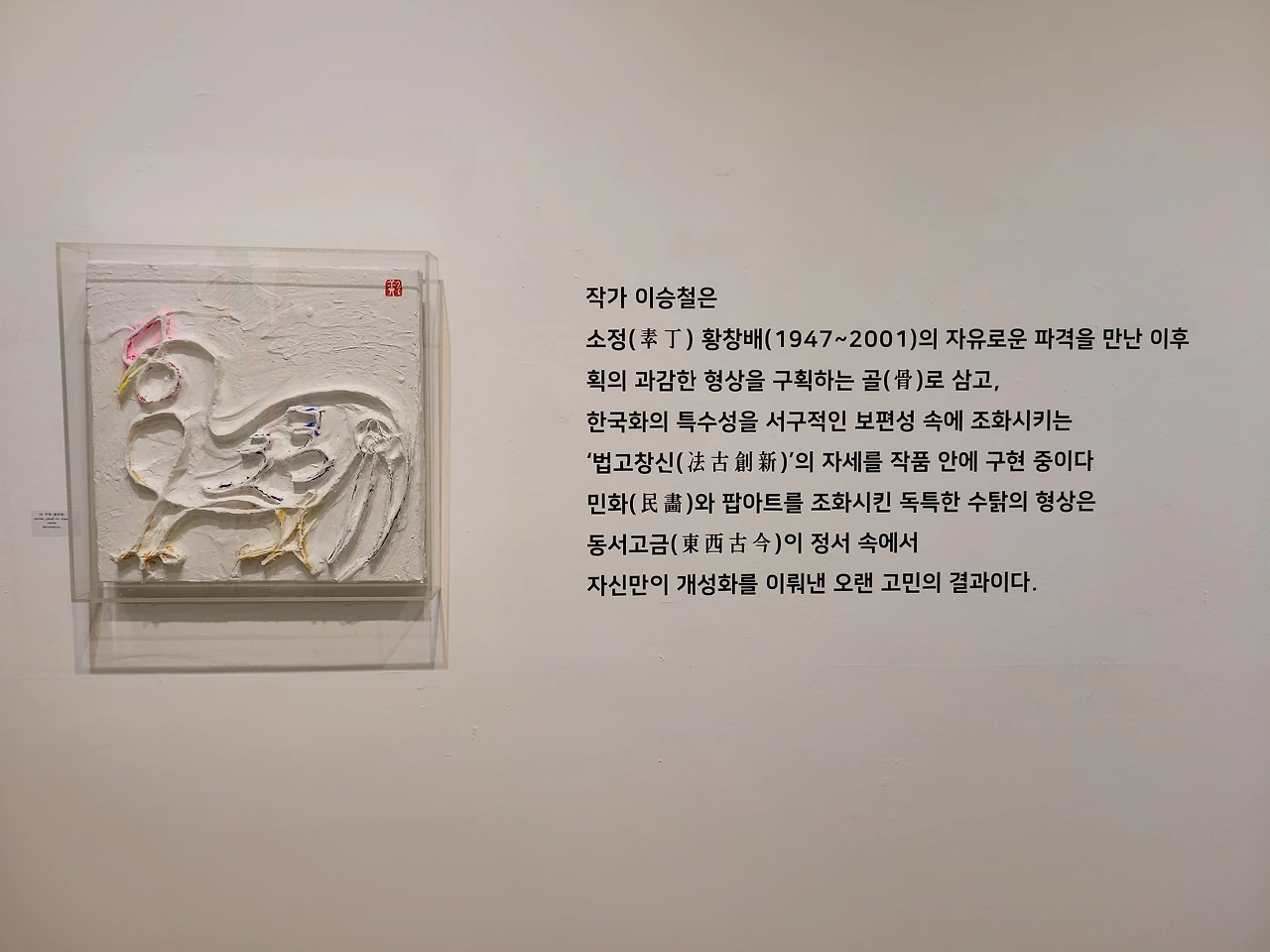 특히, 전시장에는 이승철 작가 작품이 아닌 작품 한 점이 같이 전시되어있다. 황창배(1947~2001) 작가의 말년 작품이다. 약간은 생뚱맞은 느낌이 들기도 하는데 작가의 작품과 연결점이 이어져 있다고 한다. 그 이유를 이렇게 말하고 있다. "소정 황창배의 자유로운 파격을 만난 이후 획의 과감한 형상을 구획하는 골(骨)로 삼고 한국화의 특수성을 서구적인 보편성 속에 조화시키는 법고창신法古創新의 자세를 작품 안에 구현 중이다. 민화와 팝아트를 조화시킨 독특한 수탉의 형상은 동서고금東西古今이 정서 속에서 자신만이 개성화를 이뤄낸 오랜 고민의 결과이다"