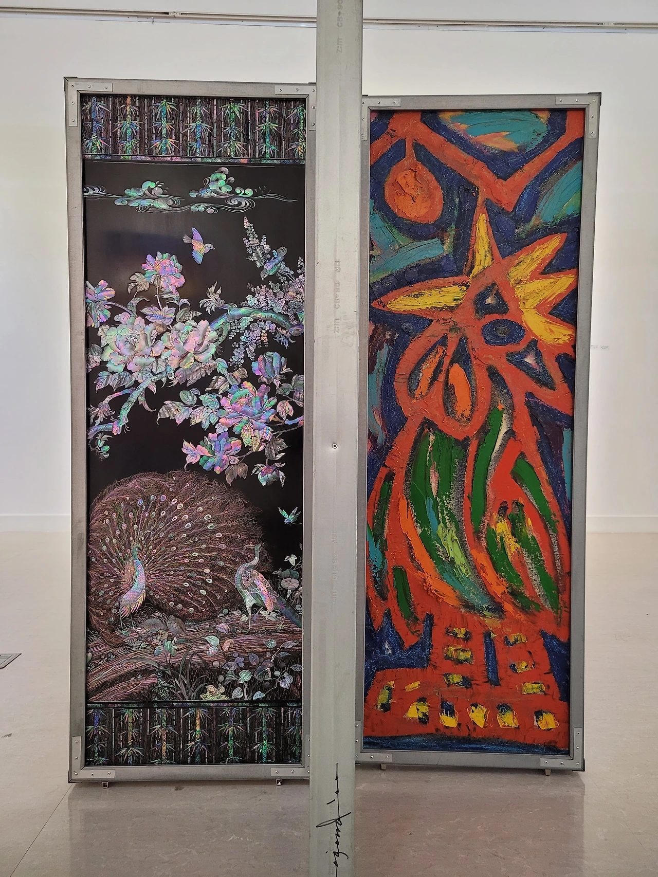 네 번째는 병풍처럼 만든 두쪽 자리 작품으로 모두 연결하면 6쪽 병풍이 된다. 앞면은 수탉의 작품이 들어있고 뒷면은 자개로 작업한 옛 작품 속 풍경이 그대로 드러난다. 이 작품은 옛것과 현대를 보여주기 위해 어느 집 장롱 문짝에 있는 조개 작품을 그대로 활용하여 그 뒷면에 수탉 작업을 하였다고 한다. 옛 장인의 수고로움을 버리지 않고 그대로 남겨 놓음으로써 새로운 작품의 조화를 만들어 내었다.