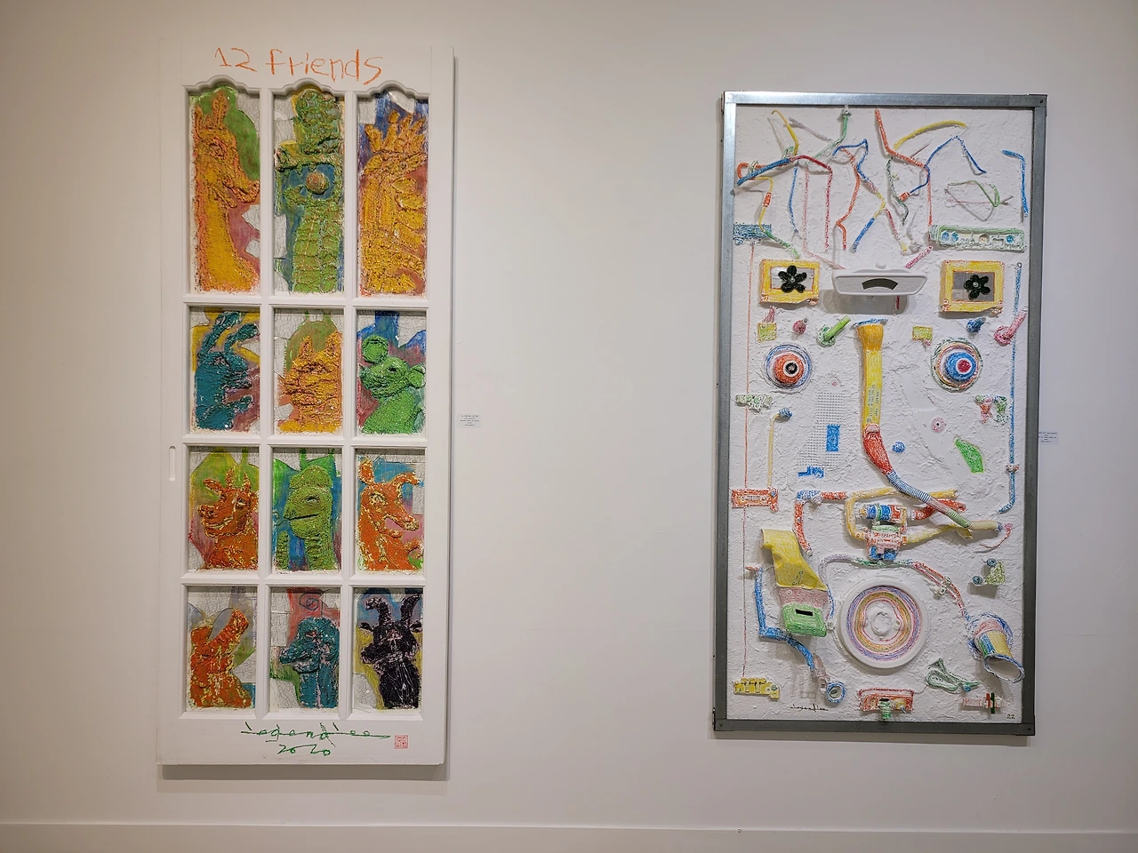 다섯째는 작품의 액자다. 액자의 모형도 각기 다 다르고 특이함을 느낀다. 바로 옛 집안의 문짝을 그대로 재활용하여 작품을 만든 것도 있고 새시 속에 들어있는 철제 프레임을 활용하여 만든 것도 있다. 또 기존의 액자틀에 새로운 색을 입혀 작품과 조화를 이루게 함으로써 작품의 멋을 살려냈다. 정형화되지 않은 틀이 자유로운 작품과 잘 어울린다.