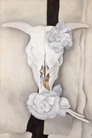 소 두개골과 장미꽃이 있습니다. 그것도 하얀 장미입니다. 작품의 제목으로 보면 옥양목玉洋木으로 만든 조화입니다. 옥양목 장미는 뉴멕시코에서 무덤을 장식하는 데 사용된다고 하네요. 뼈가 아름다워서일까 아니면 죽음의 숭고함에 대한 경건함일까. 궁금해집니다.