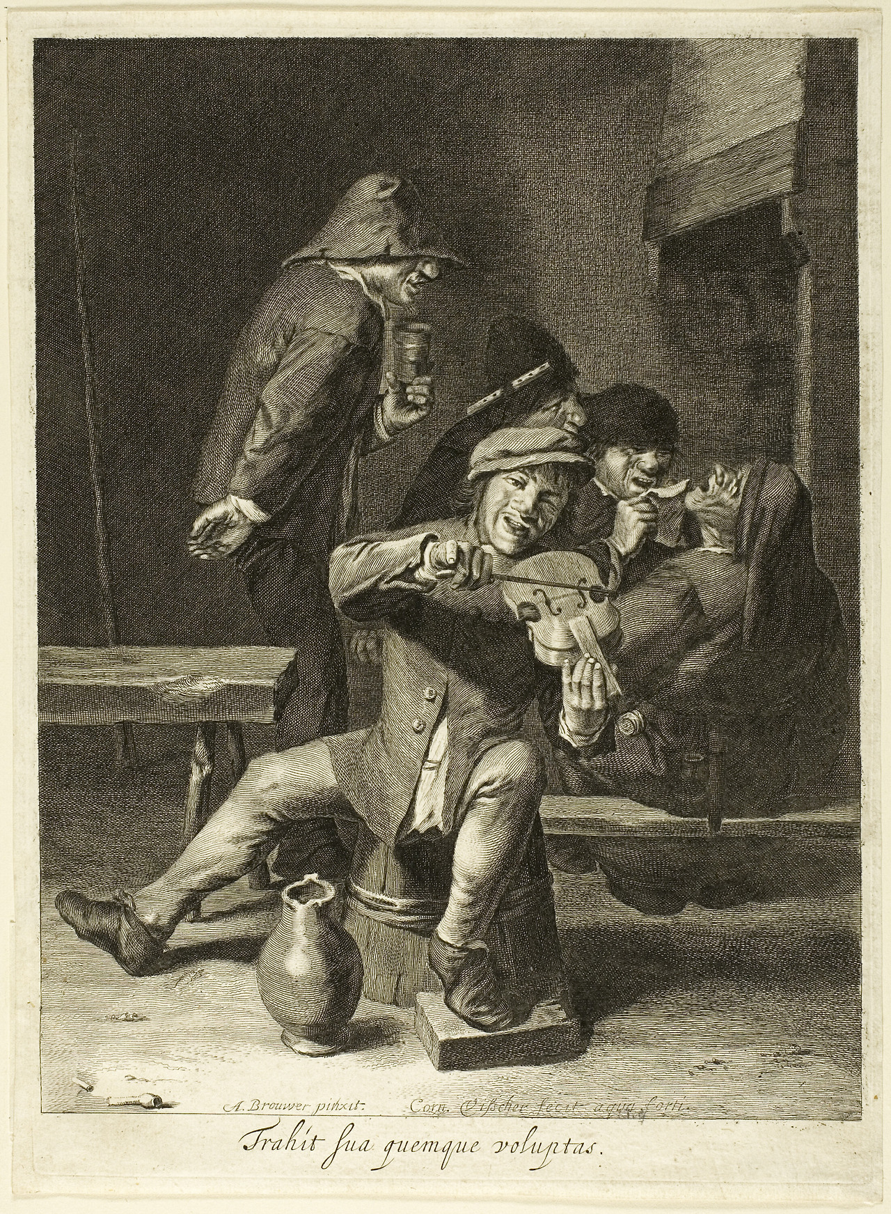 이런 소란스러운 분위기는 아무것도 아니다는 듯이 그냥 즐기라고 말입니다. 그러고 보니 악사 뒤 인물 머리에는 피리 같은 악기가 있는 것 같네요. 두 사람의 목소리가 커지니 말리려고 다가간 것인지도 모르겠습니다. 노동으로 힘들었던 하루의 일과를 이렇게 한잔하고 부딪치며 마무리하는 것이 일상이 되었는가 봅니다. 작품은 사실적이면서도 불쾌하지 않은 화면으로 유쾌함마저 던지고 있습니다.