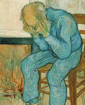 또 하나 작품으로 '의자에 앉아 우는 노인' 작품이 있다. 1890년도 작품으로 노인이 벽난로 옆 낡은 의자에 앉아 주먹으로 얼굴을 가린 채 흐느껴 울고 있다. 머리가 다 빠진 희끗희끗한 머리털과 파란색 옷이 주는 강렬함이 상황을 잘 알려주고 있다.