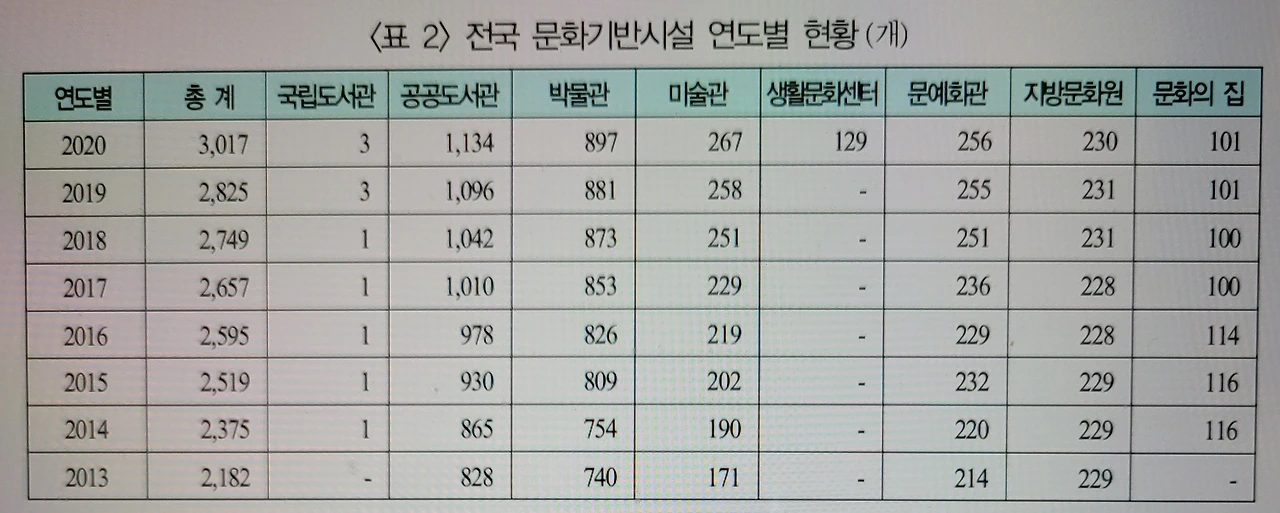 문화관광체육부에서 정리한 자료(홈페이지)를 참고하면, 2020년도 기준, 전국 문화시설은 문예회관 등을 포함해 총 3,017개입니다. 그중 도서관 1,137개, 박물관 897개(292 수도권, 605 지역), 미술관 267개(104 수도권, 163 지역)입니다. 그렇지만 미술관, 박물관의 수도권 편중이 심하다 할 수 있습니다.