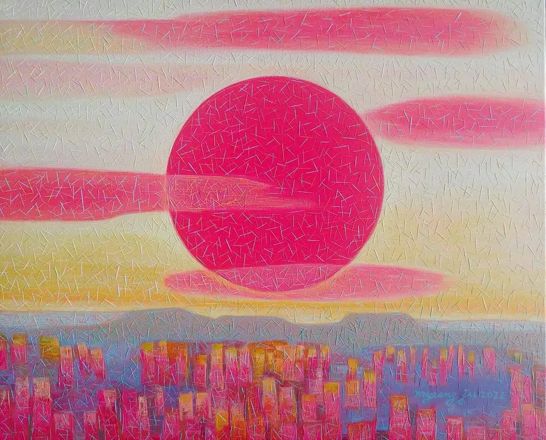 작가의 작품은 단순한 게 표현해내는 작품 속 구도와 사물의 배치가 주는 느낌이 좋다. 거기에 작가의 작품 속에 나타나는 독특한 표현 방법으로 인해 작품은 조금 더 신비감을 갖게 하는 특성이 있다. 칼끝으로 찍어낸 짧은 선의 흔적들은 작품에 신비감을 더해준다. 이 작품 또한 태양과 풍경 속의 이미지가 단순하지 않고 더 도드라져 보이는 이유 중 하나가 바로 그 선의 찍힘이다.