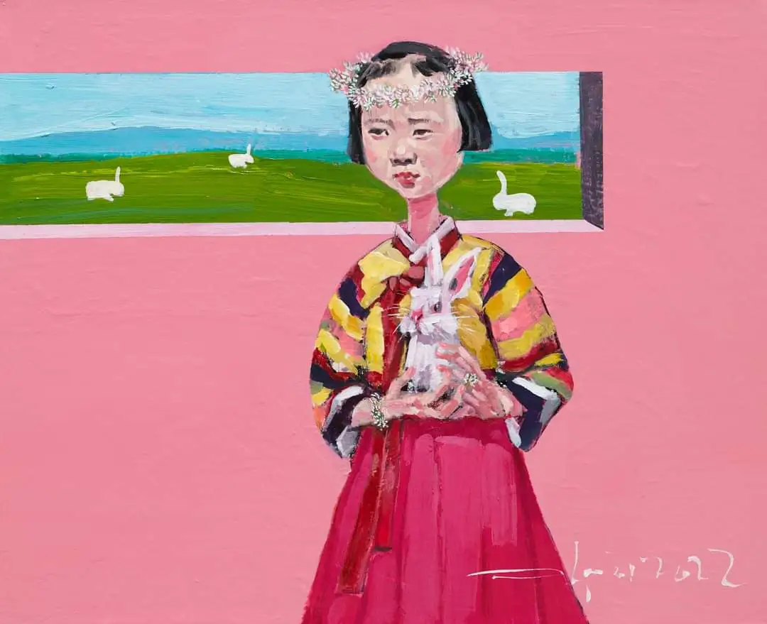 두 작품은 '2022년 아트버스카프의 연말 선물전'에 나온 작품이다. 첫 작품은 제목이 <선물 2023>이다. 2023년 계묘년癸卯年 검은 토끼의 해를 맞아 새해 색동저고리 꼬까옷을 입은 아이가 토끼를 선물로 들고 있다. 배경이 된 뒤쪽 창문 너머는 넓은 들판에서 토끼가 풀을 뜯고 있다.