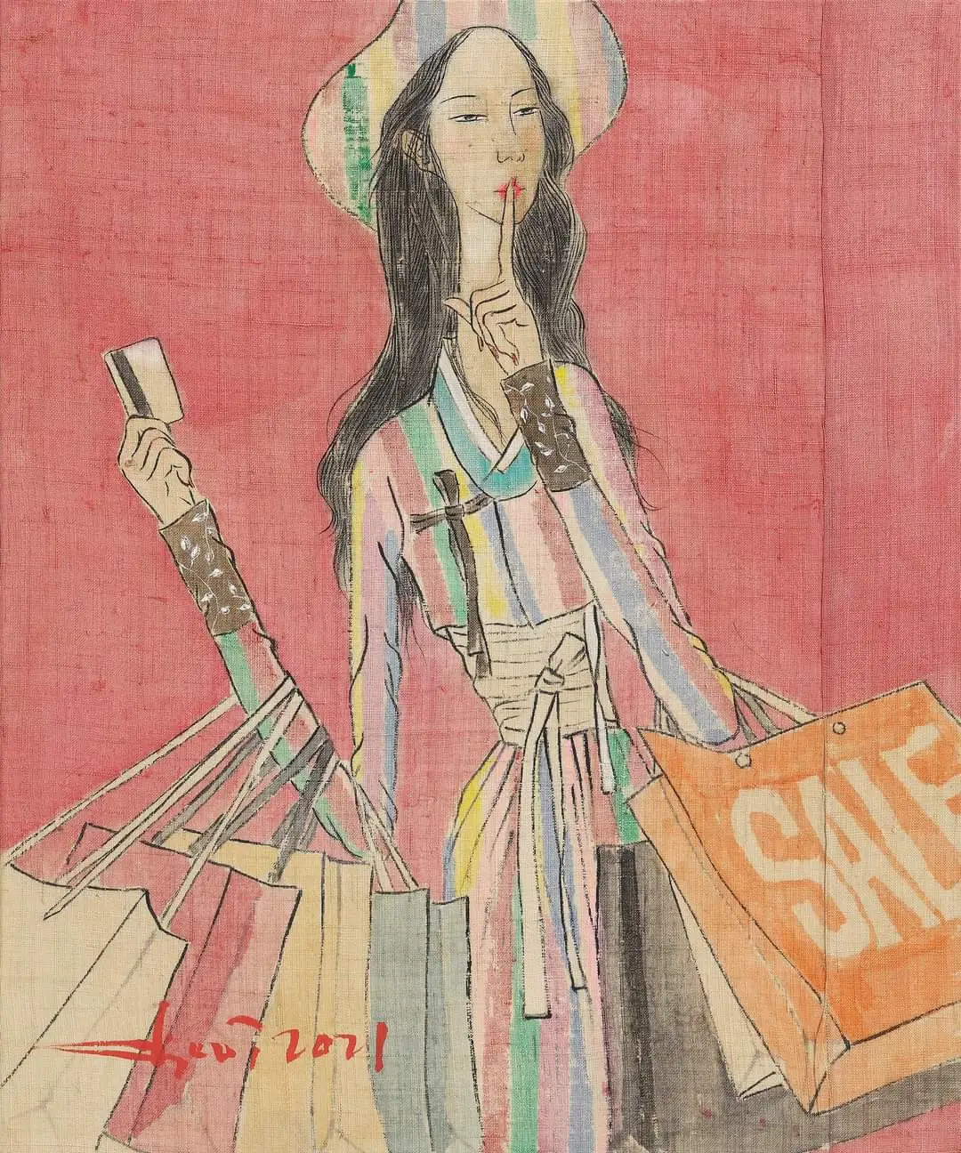 양손에 가득한 쇼핑백이 무거워 보이지도 않는 듯 아직도 한 손에는 카드를 들고 있다. 연말 세일 기간을 통해 그동안 갖고 싶었던 쇼핑목록을 찾아다니는 듯하다. 누군가 옆에서 너무 많이 사는 게 아니냐고 묻는 듯 한 손을 입술에 대어 조용히 하라는 메시지를 보낸다. 한꺼번에 너무 많이 사면 혼날 것을 염두에 둔 것인가 아니면 다음 목록을 찾아가자고 하는 행위일까. 그녀의 표정에선 아직도 부족함이 느껴진다.