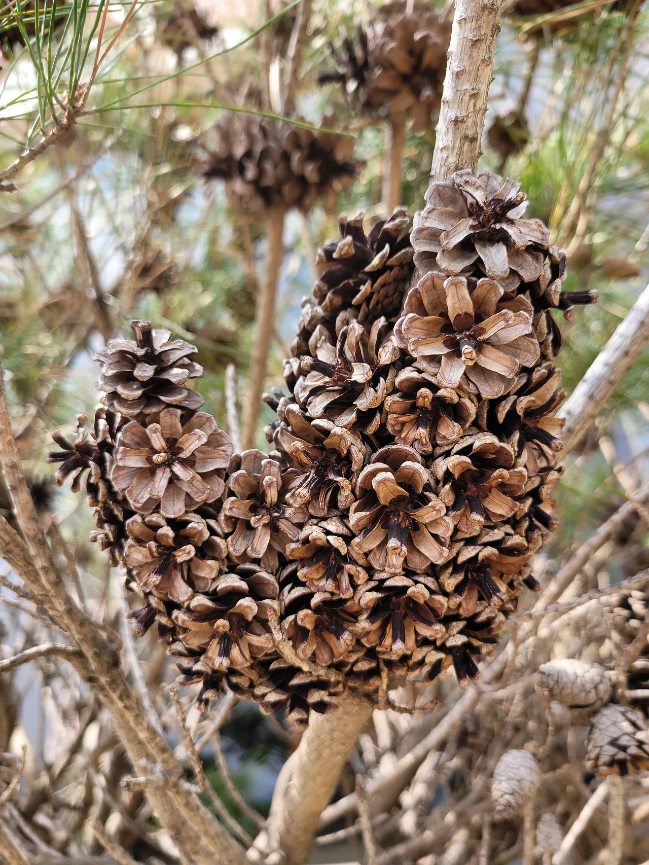 그런 반면, 화단에서 가꾸는 소나무는 솔방울을 포도송이처럼 맺었다.