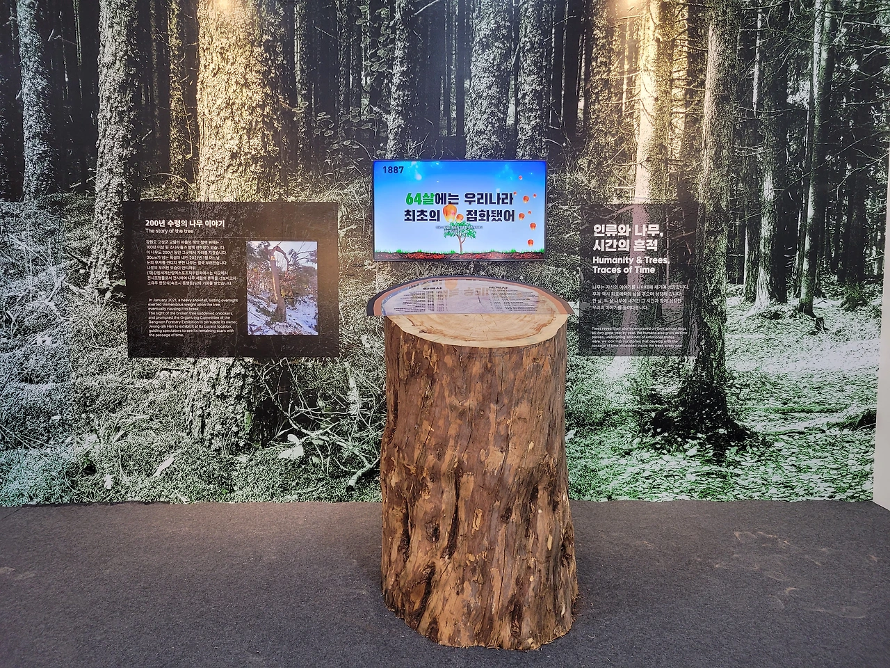 인류가 산림과 함께 해온 시간의 흐름을 나무의 나이테와 거대한 나무 전시를 통해 보여준다.