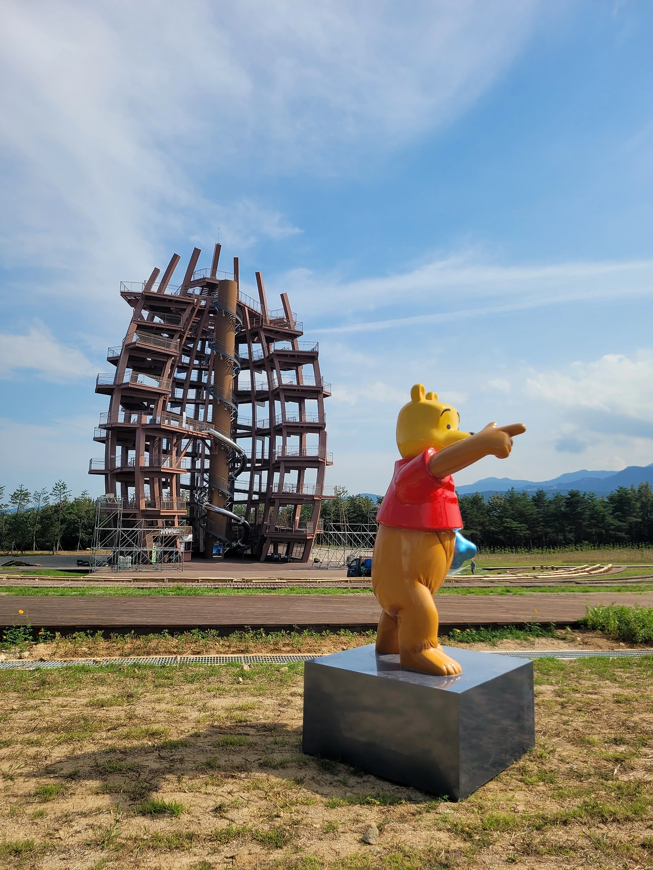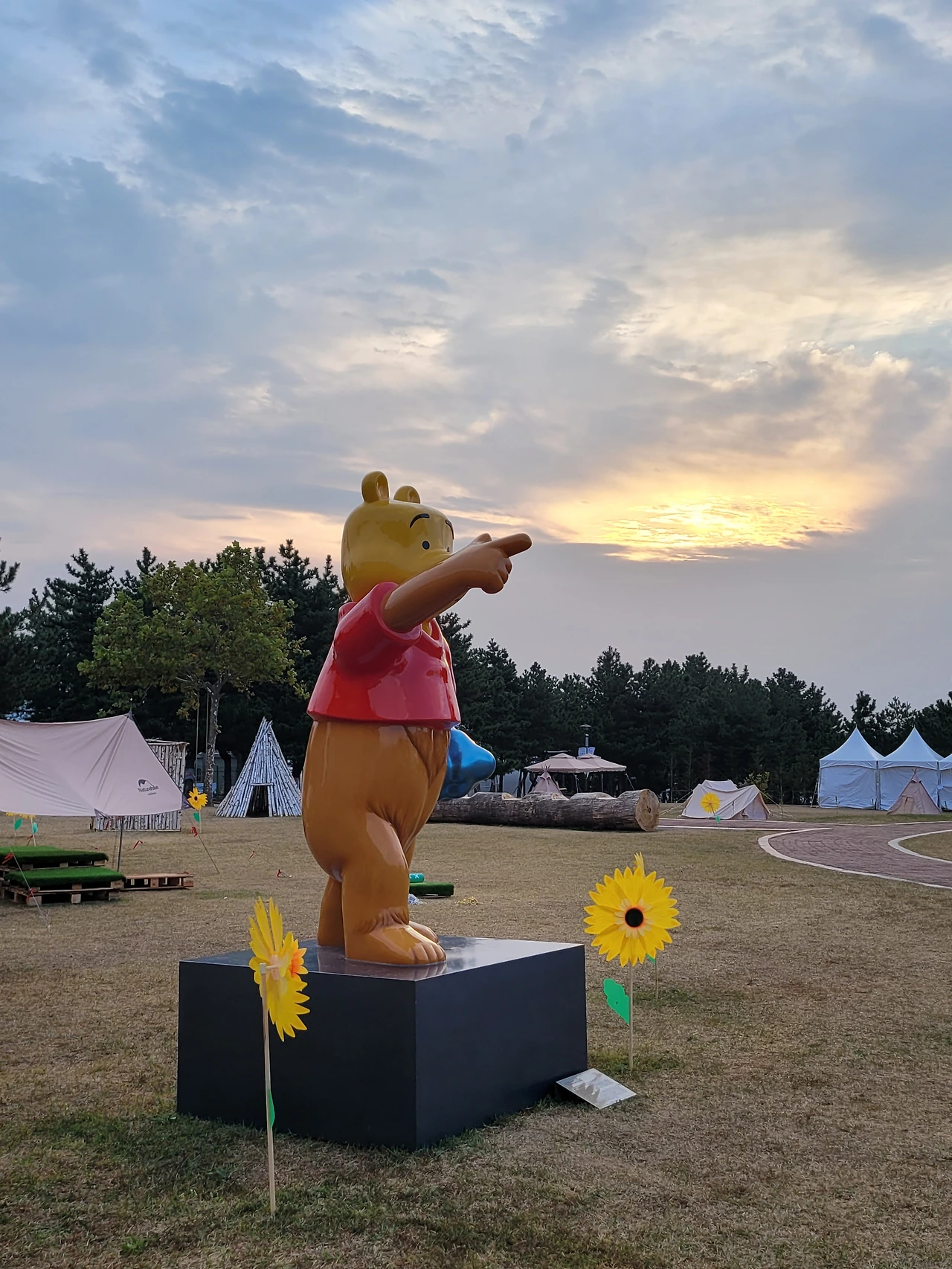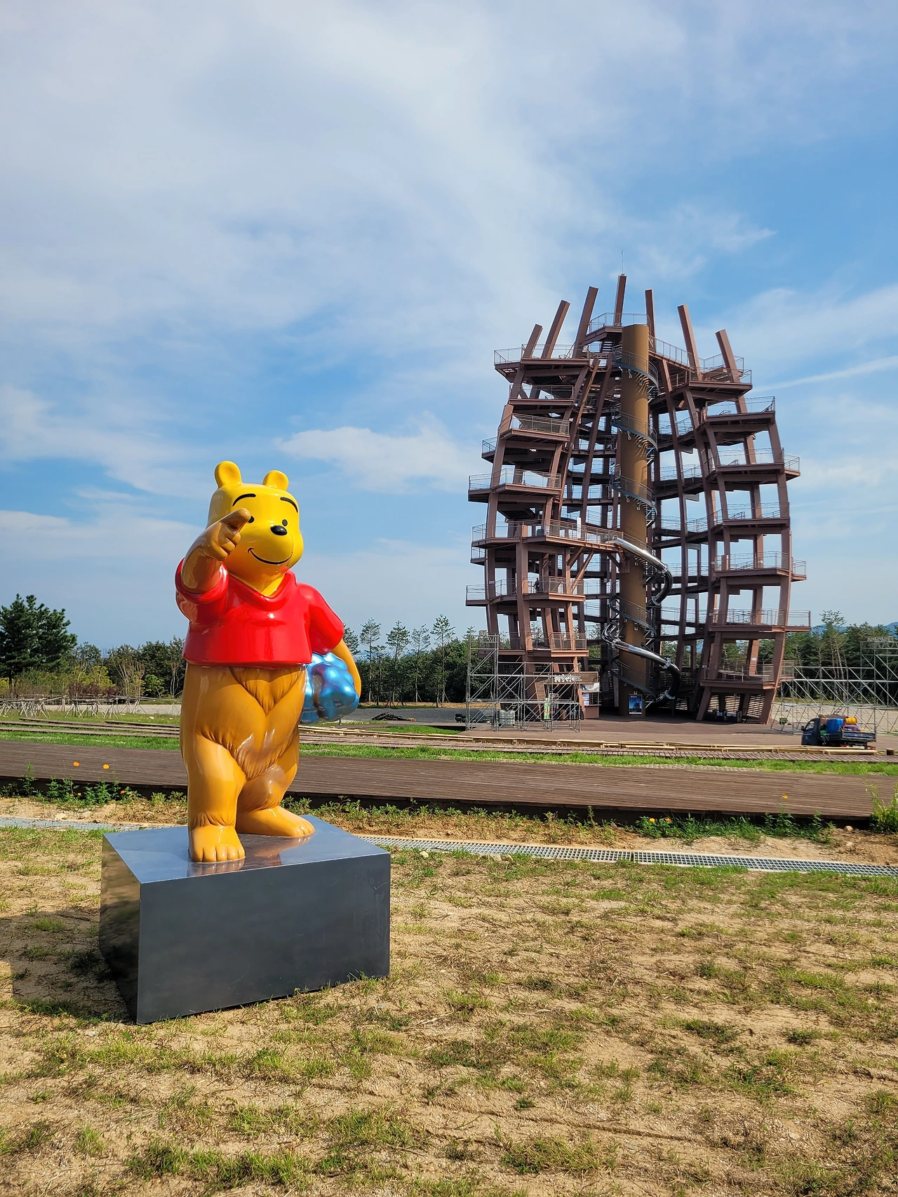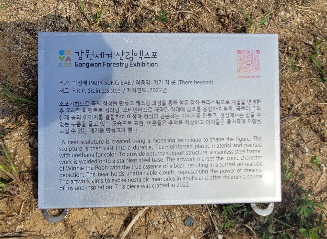 * 작가의 작품 설명 : 소조기법으로 곰의 형상을 만들고 캐스팅 과정을 통해 섬유강화 플라스틱으로 재질을 변경한 후 우레탄 페인트로 컬러링. 스테인리스로 제작된 좌대에 골조를 용접하여 부착. 곰돌이 푸와 실제 곰의 이미지를 결합하여 이상과 현실이 공존하는 이미지를 만들고 현실에서는 잡을 수 없는 구름을 들고 있는 모습으로 표현. 어른들은 추억을 회상하고 아이들은 즐거움과 희망을 느낄 수 있는 계기를 만들고자 했다.