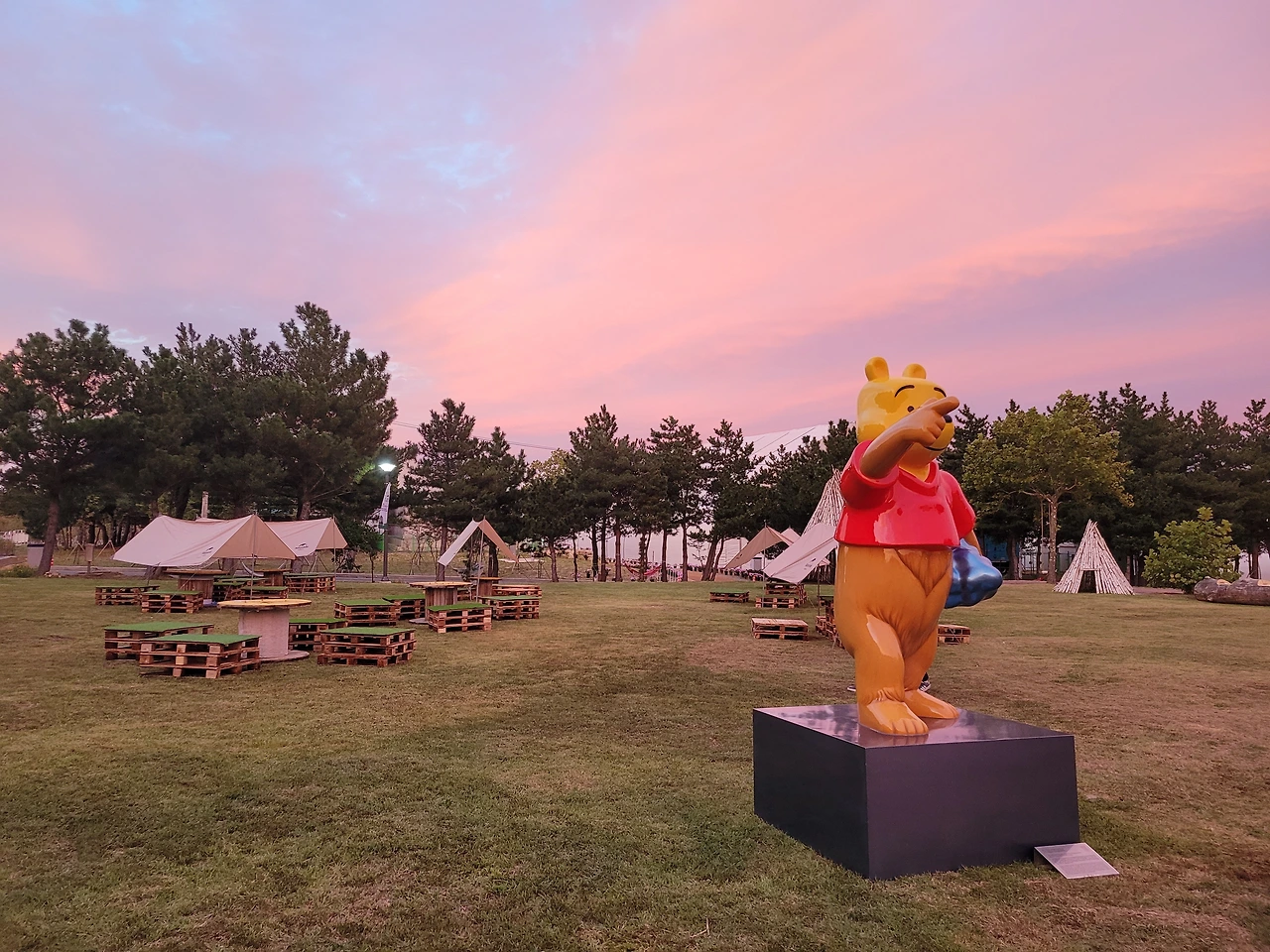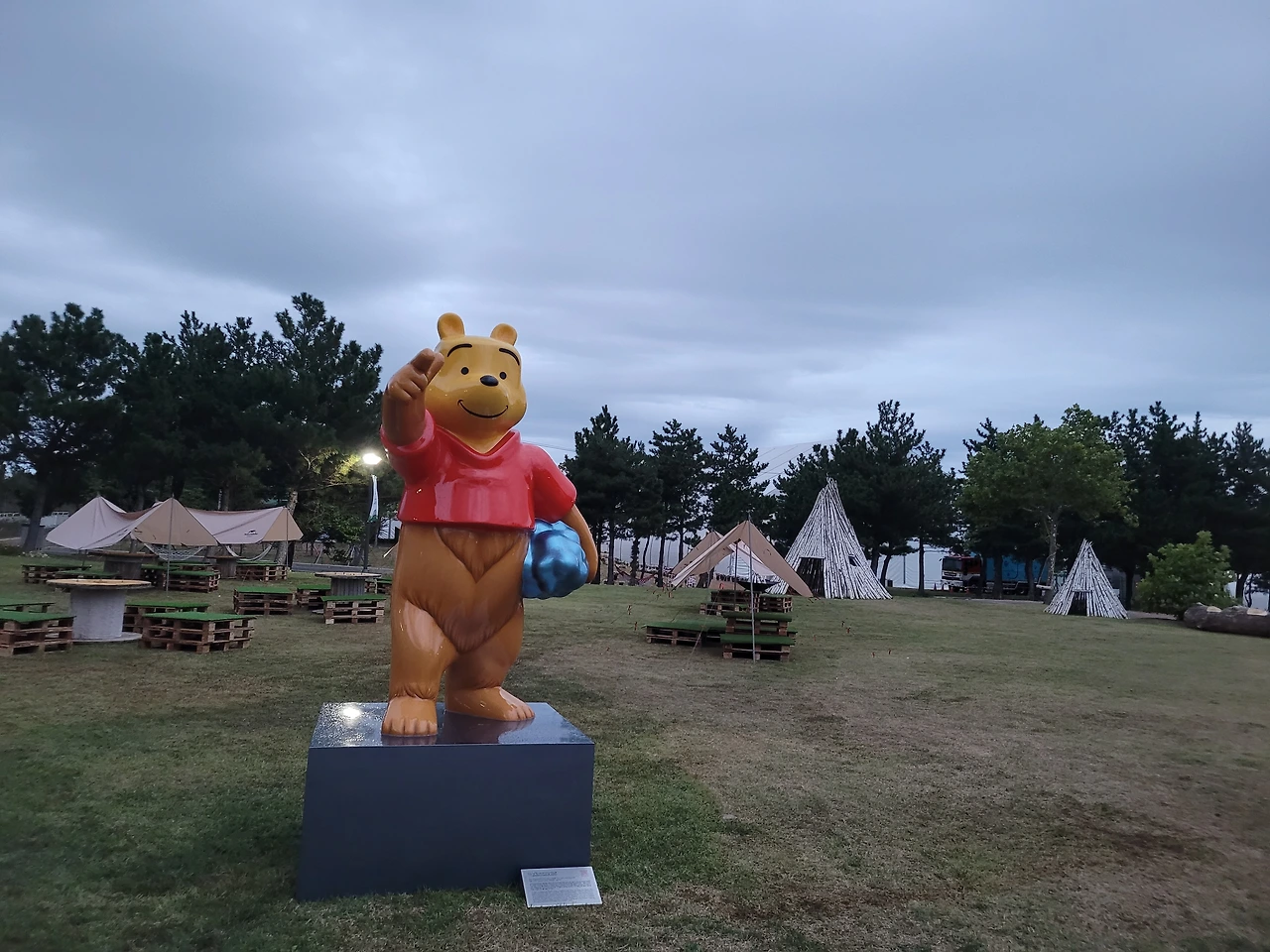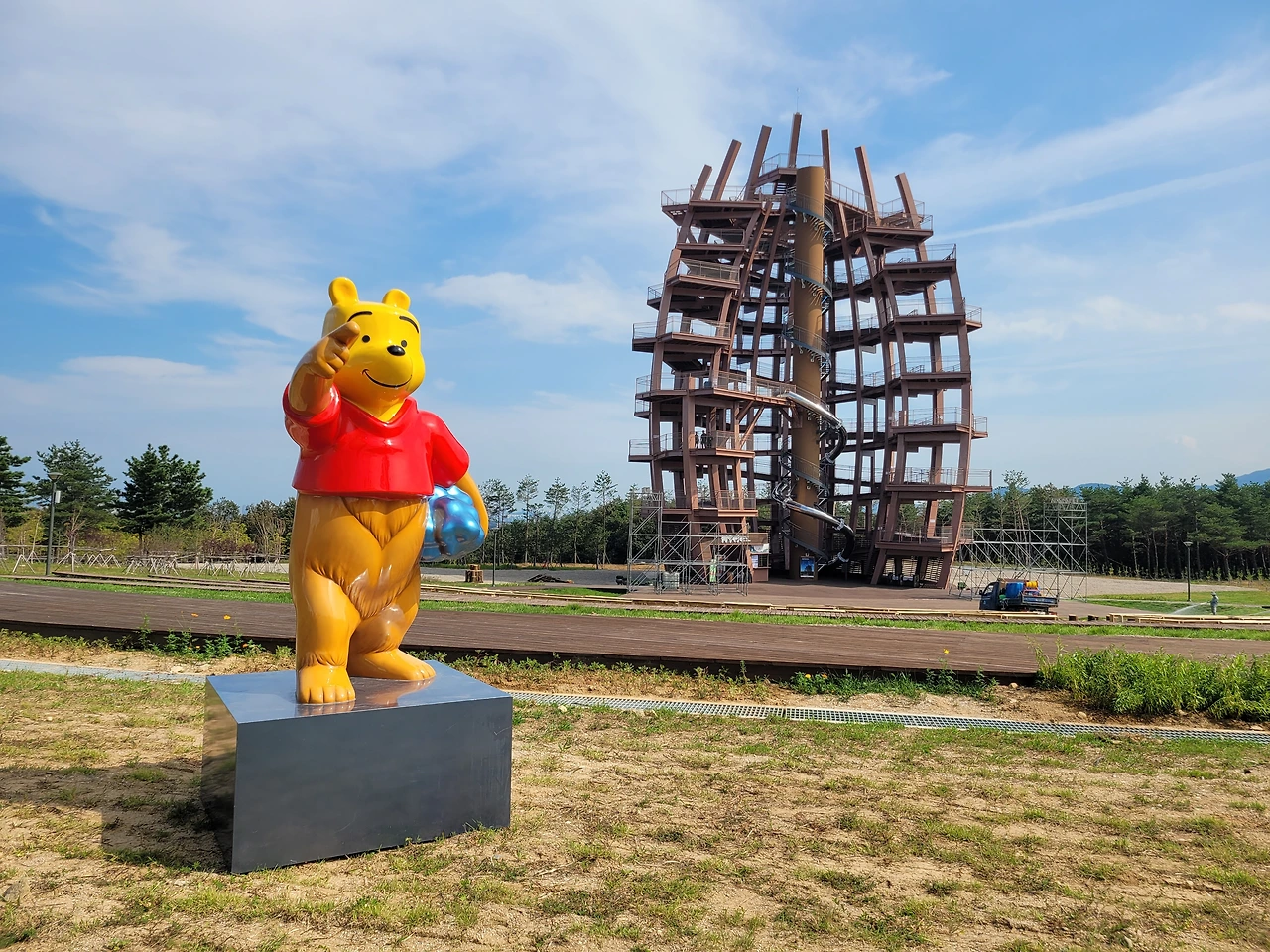 * 작가의 작품 설명 : 소조기법으로 곰의 형상을 만들고 캐스팅 과정을 통해 섬유강화 플라스틱으로 재질을 변경한 후 우레탄 페인트로 컬러링. 스테인리스로 제작된 좌대에 골조를 용접하여 부착. 곰돌이 푸와 실제 곰의 이미지를 결합하여 이상과 현실이 공존하는 이미지를 만들고 현실에서는 잡을 수 없는 구름을 들고 있는 모습으로 표현. 어른들은 추억을 회상하고 아이들은 즐거움과 희망을 느낄 수 있는 계기를 만들고자 했다.