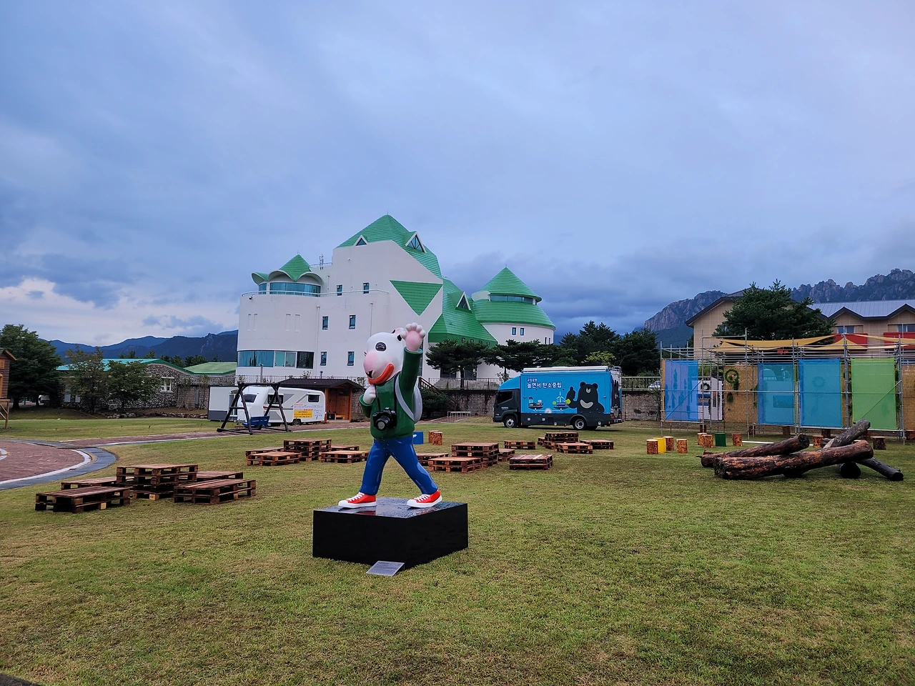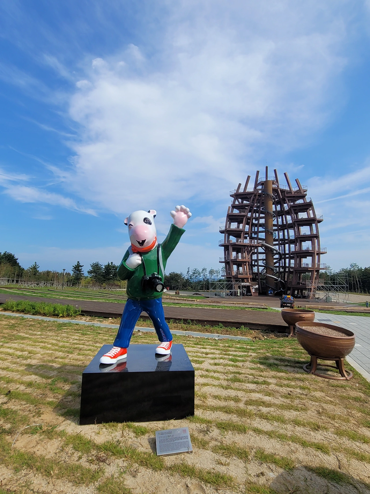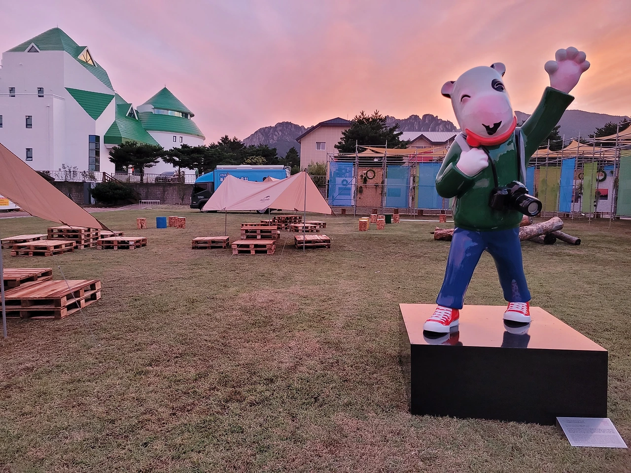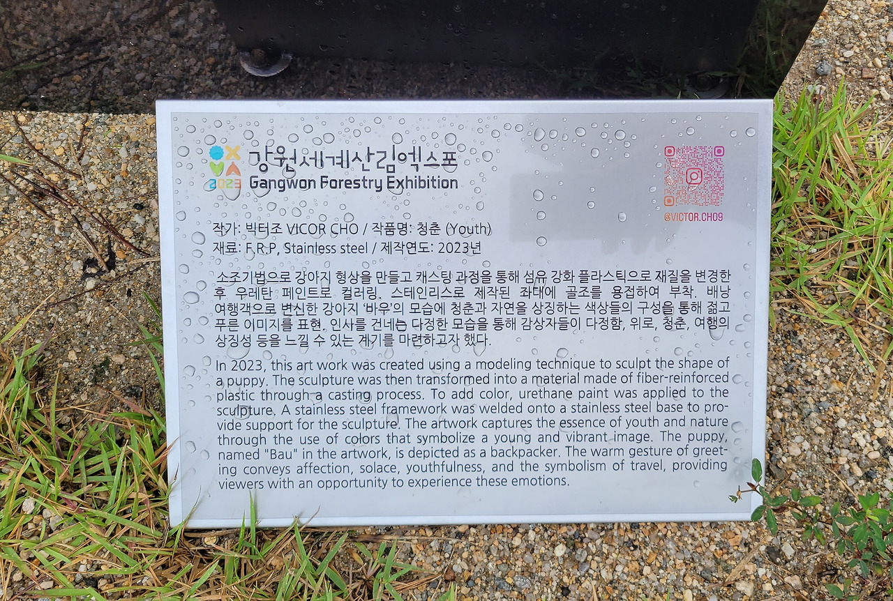 * 작가의 작품설명 : 소조기법으로 강아지 형상을 만들고 캐스팅 과정을 통해 섬유강화 플라스틱으로 재질을 변경한 후 우레탄 페인트로 컬러링. 스테인리스로 제작된 좌대에 골조를 용접하여 부착. 배난여행객으로 변신한 강아지 '바우'의 모습에 청춘과 자연을 상징하는 색상들의 구성을 통해 젊고 푸른 이미지를 표현. 인사를 건네는 다정한 모습을 통해 감상자들이 다정함, 위로, 청춘, 여행의 상징성 등을 느낄 수 있는 계기를 마련하고자 했다.