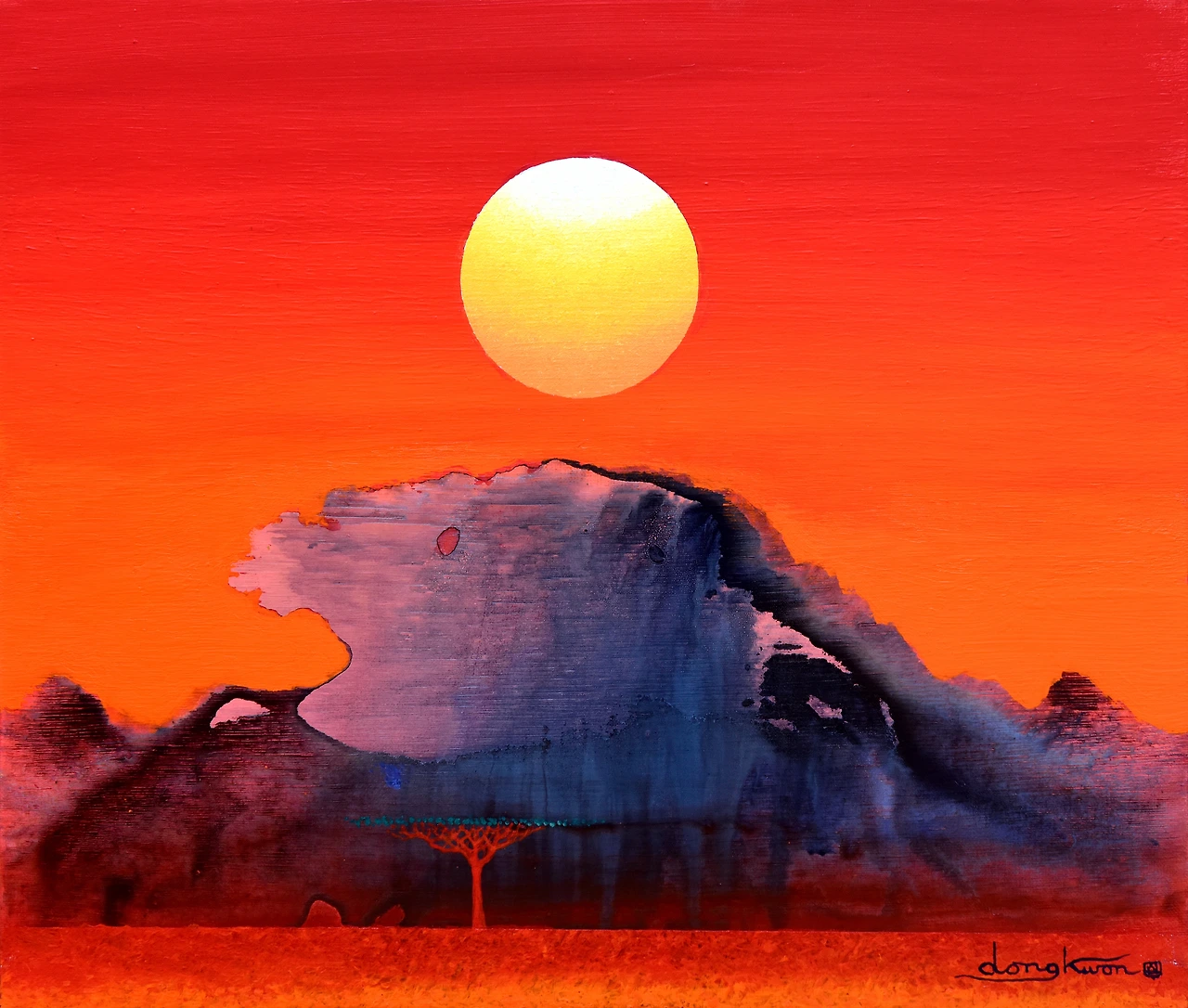 그렇지만 붉은 작품은 사막에서 바라다본 대지의 기운이다. 태양이 떠오르는 순간 정적에 감싸인 공간 속에 저 멀리 홀로 서 있는 거대한 나무가 세상을 떠받치듯 서 있다. 그것은 작가가 느꼈던 공간에 대한 표현이다. 너무 붉다 못해 검게 보이는 앞쪽의 풍경 속에서 홀연히 서 있는 나무는 우주의 기운과 대지의 기운을 가득 담은 채 세상을 향해 그 삶의 의미를 묻고 있다. 광활한 사막에서 바라보는 일출은 어떨 것인가. 수많은 인파 속에서도 홀로 서 있는 듯 모든 것을 삼키어 버린 순간에 보게 되는 풍경은 대자연의 힘 그 자체이다. 그 기운은 스스로 받아들일 때 나와 하나가 된다.