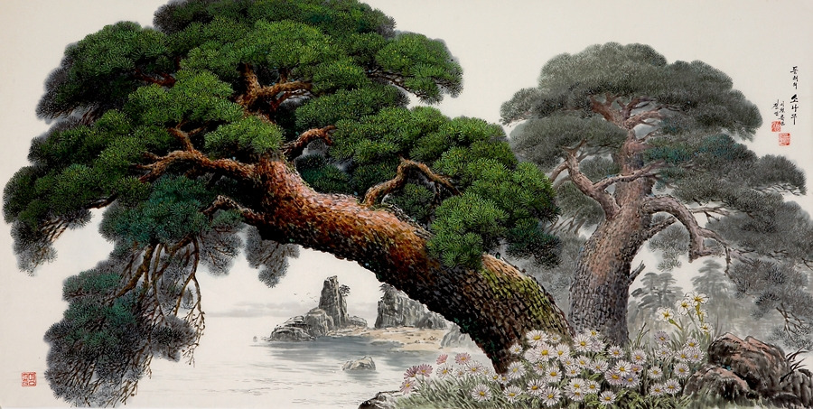 위 작품은 북한의 전영 작가 작품인 동해의 소나무다.