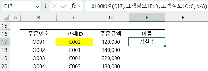 =XLOOKUP([@고객 ID], 고객정보!B:B, 고객정보!C:C, "N/A")