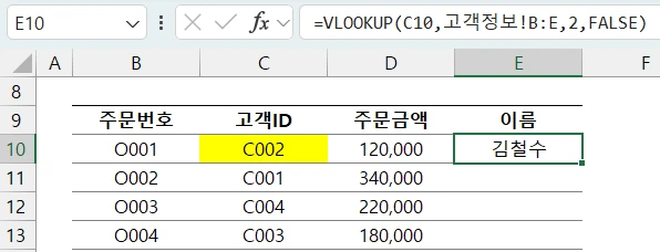 결과: 동일하게 주문번호 O001 → 이름 "김철수"