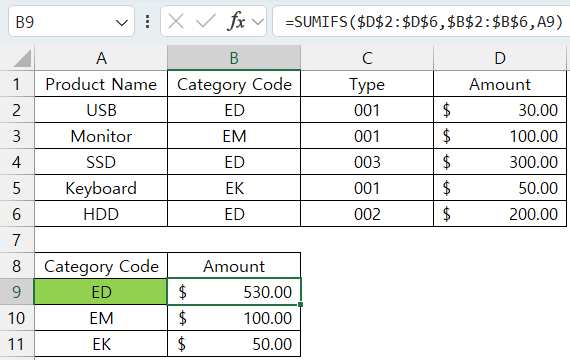 =SUMIFS($D$2:$D$6, $B$2:$B$6,A9)
