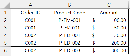 ✔ 주문 데이터 Sheet (Order ID / Product Code / Amount)