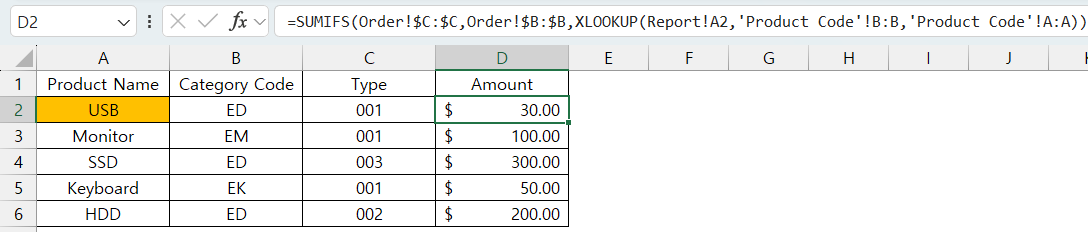 =SUMIFS(Order!$C:$C,Order!$B:$B,XLOOKUP(Report!A2,'Product Code'!B:B,'Product Code'!A:A))