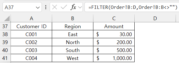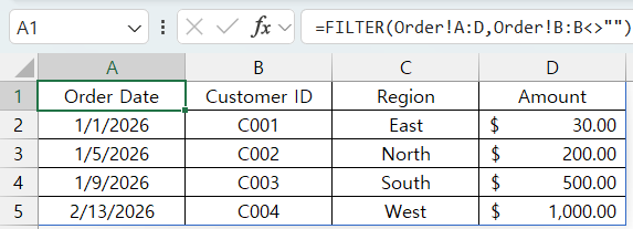 =FILTER(Order!B:D, Order!B:B<>"")