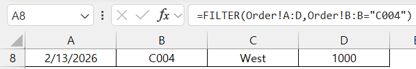 =FILTER(Order!A:D,Order!B:B=XLOOKUP('Customer Master'!B5,'Customer Master'!B:B,'Customer Master'!A:A))