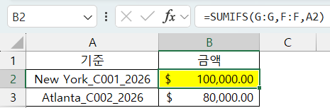 =SUMIFS(금액범위, 기준 Column, "New York_C001_2026")