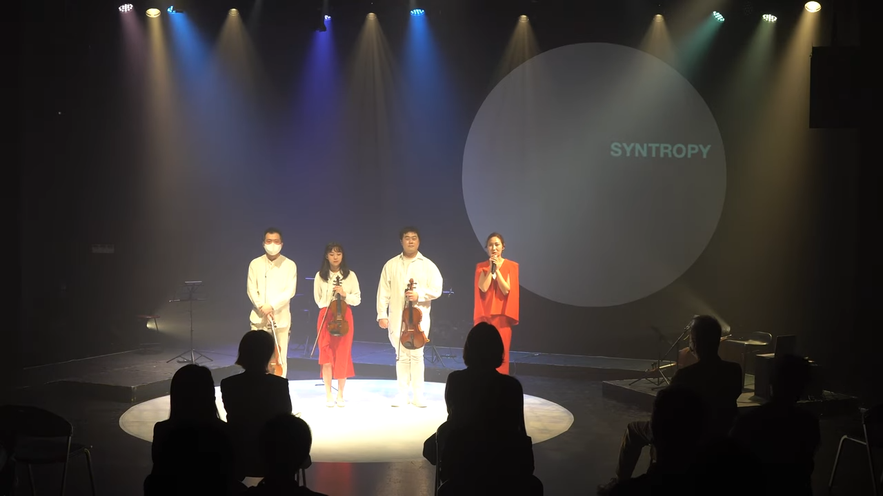 사전 예약을 통해 관람을 신청한 다양한 연령대의 관객들이 입장하고 고즈넉한 조명과 함께 공연이 시작되었다. 무대 중앙을 중심으로 좌측에 세 명읜 현악 연주자들이 자리했고, 우측에 지박이 무게를 이룬 구조였다. 영상과 현악, 사운드 아트가 조화를 이루며 본 공연의 맥이 관객에게 분명하게 전달된 오프닝 곡 ‘Ruins’는 괴기스럽고 소름을 돋게 만드는 음의 전개로 공연의 출발선에서부터 관객 모두를 잔뜩 움츠리게 만들었다. 우아한 곡조의 바이올린과 비올라의 협연이 인상적이었던 다음 곡 ‘The People’은 루프 음과 첼로의 상승과 혼미한 여상의 번짐 속에서 새로운 전환을 예고했다. 4명의 현이 풀로 연주되며 시작된 ‘Magritte’는 밝은 톤의 사운드로 변화를 이끌었고, 공연 타이틀인 ‘Syntropy’에 대한 각인을 분명히 밝혀낸 순서였다. 다음 곡 ‘The War’는 제목에서 연상되듯 광폭하고 맹렬한 현악의 울림이 전투와 폭격의 이미지를 띄며 공연에 긴장감을 더해 줬다.