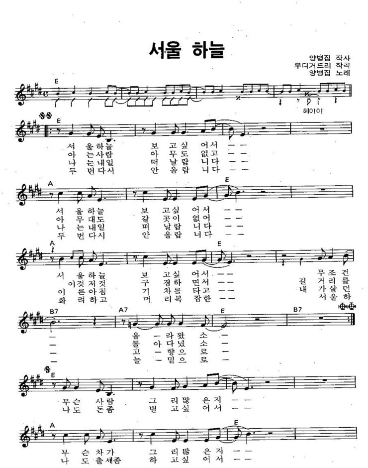 양병집의 1집에서 눈에 띄는 곡은 <역逆>과 <잃어버린 전설>, <타복네> 외에 <서울 하늘1>이다. 이 곡은 1960년대 후반부터 진행된 이촌향도의 움직임을 주제로 담고 있다. 우디 거스리의 <New York Town>에 양병집이 가사를 입힌 <서울 하늘1>은 보다 나은 생활을 위해 무작정 도시로 이동했지만, 인구와 산업의 지나친 과밀화에 의한 주택 부족, 교통 체증, 일자리 부족 등의 문제로 생활이 쉽지 않았던 당시의 실상을 노래했다. 기대와 다른 서울의 실체를 마주하며 ‘내 안경이 기절’할 정도로 상상했던 것과 다르다고 꼬집은 양병집은 ‘두 번 다시 안올랍니다. 화려하고 복잡한 서울 하늘 밑으로’라고 노래했다. 결국 ‘노래나 불러보자’는 자조적인 어투로 <서울 하늘1>은 곡이 마무리된다.