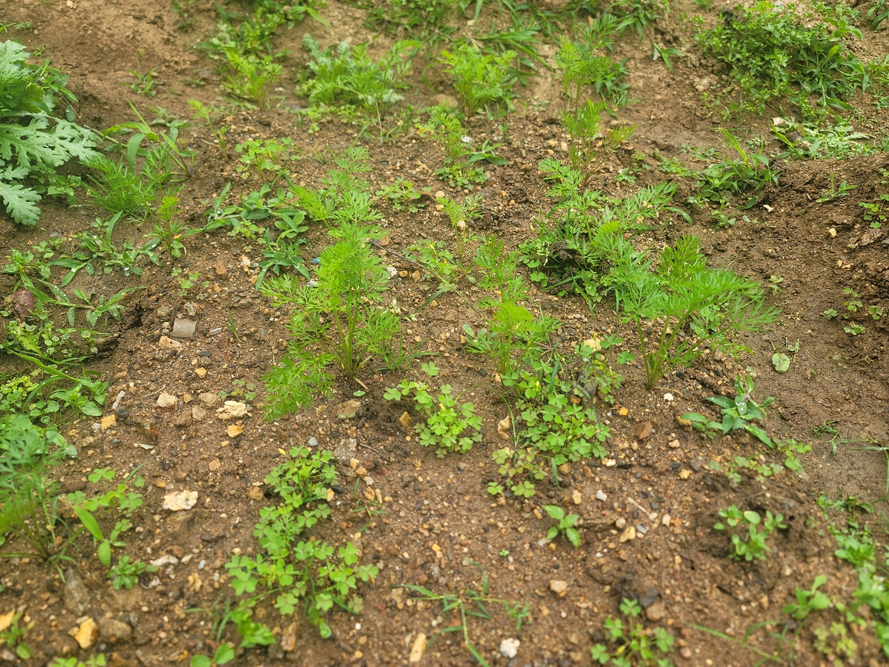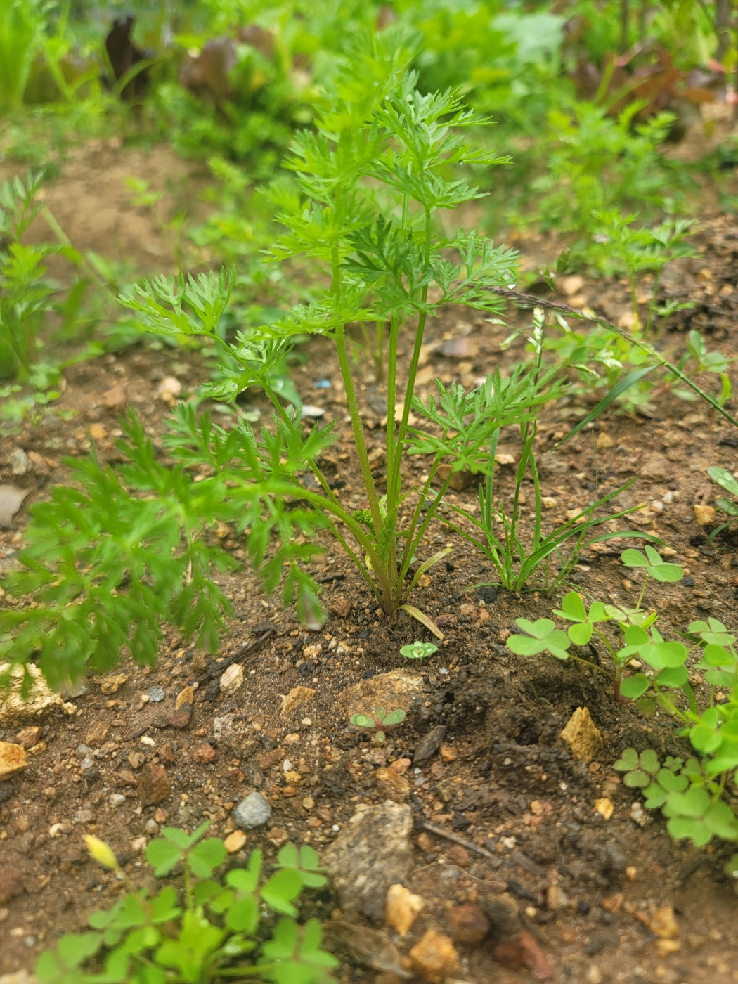 당근이 많이 자랐다. 사교성이 많은 성격인지 주변에 자잘한 잡초들이 많았다. 당근 잎이 특이해서 다행이었다. 너무 붙어 있어 잡초 뽑기가 쉽지 않았지만 실수로라도 당근을 뽑을 일은 없어 좋았다.