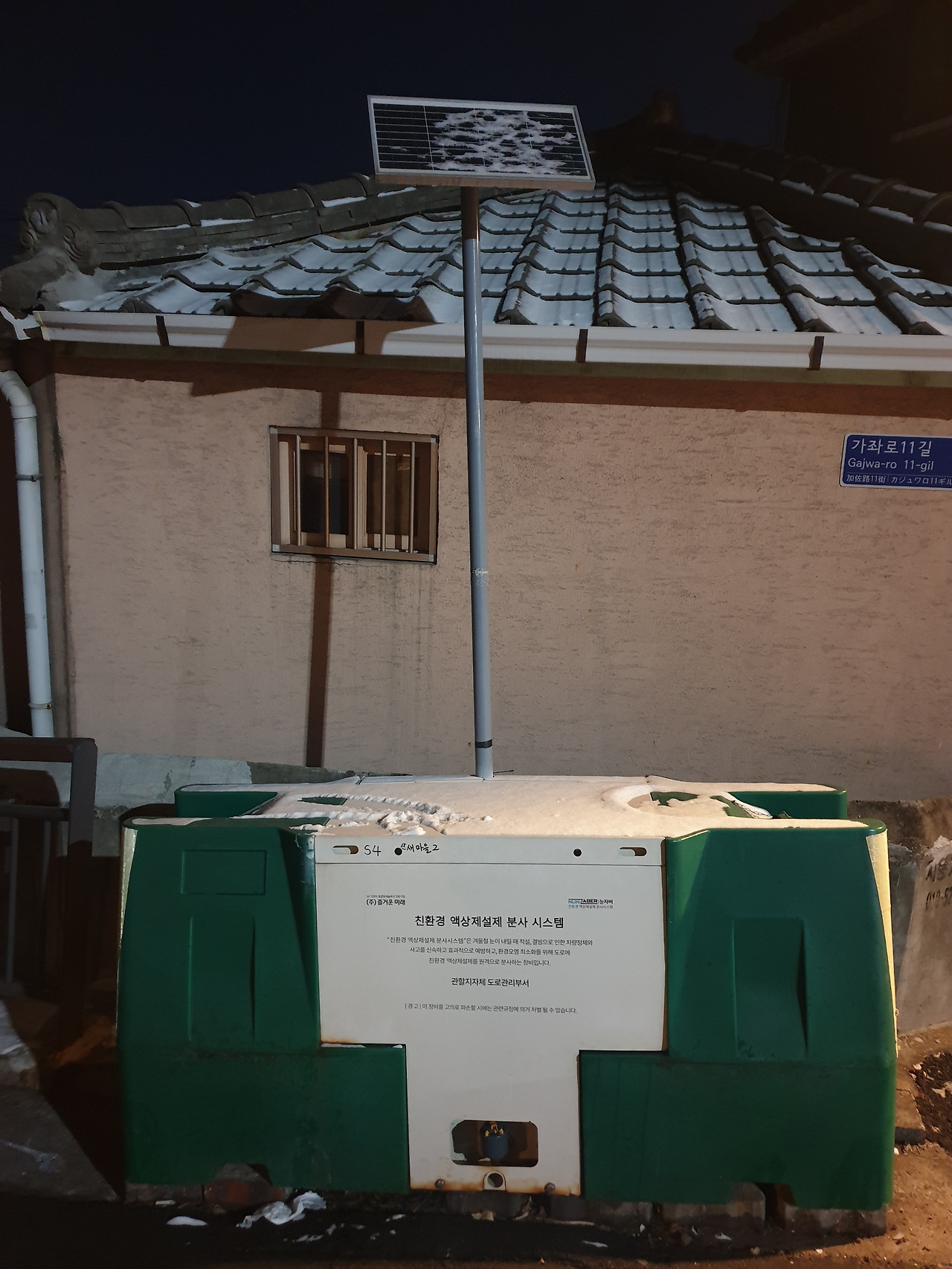 눈이 오면 자동적으로 제설제를 흩뿌리는 기계. 겨울 한 철 일하는 친구인데 오래 쉬었는지 작동하지 않았다.