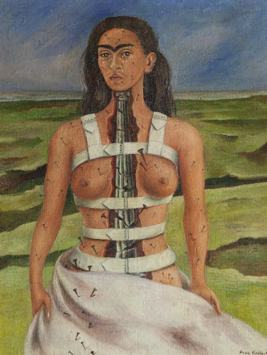 칼로가 서른 일곱에 그린 <부러진 기둥> 속에는 그녀의 모든 고통이 담겨 있습니다. 온 몸에 크고 작은 못들이 군데군데 박혀 있어요. 척추 대신 차가운 철골 구조가 그녀의 몸을 지탱하고 있습니다. 그 마저도 허리 부분에 금이 가 있네요. 몸을 제대로 고정하는 압박 밴드 안에 갇힌 칼로는 애처로운 눈물로 두 볼을 적십니다. 그림을 보는 것만으로도 견딜 수 없이 괴로워집니다. 조각조각 바스러진다는 게 무엇인지 어렴풋이 알 것 같아요. 똑똑하고 자신감 넘쳤던 여자, 칼로의 인생은 그렇게 끝장나 버리는 듯했죠. 세상 모든 일은 모조리 그녀의 계획에서 벗어난 채 흘러갔으니까요.