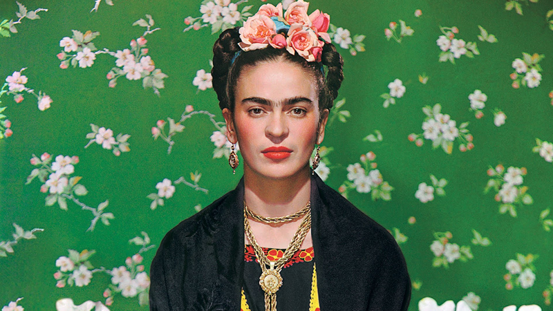 입을 꼭 다문 채 정면을 굳게 응시하고 있는 칼로의 머리 위에 놓인 꽃들만이 만개했어요.