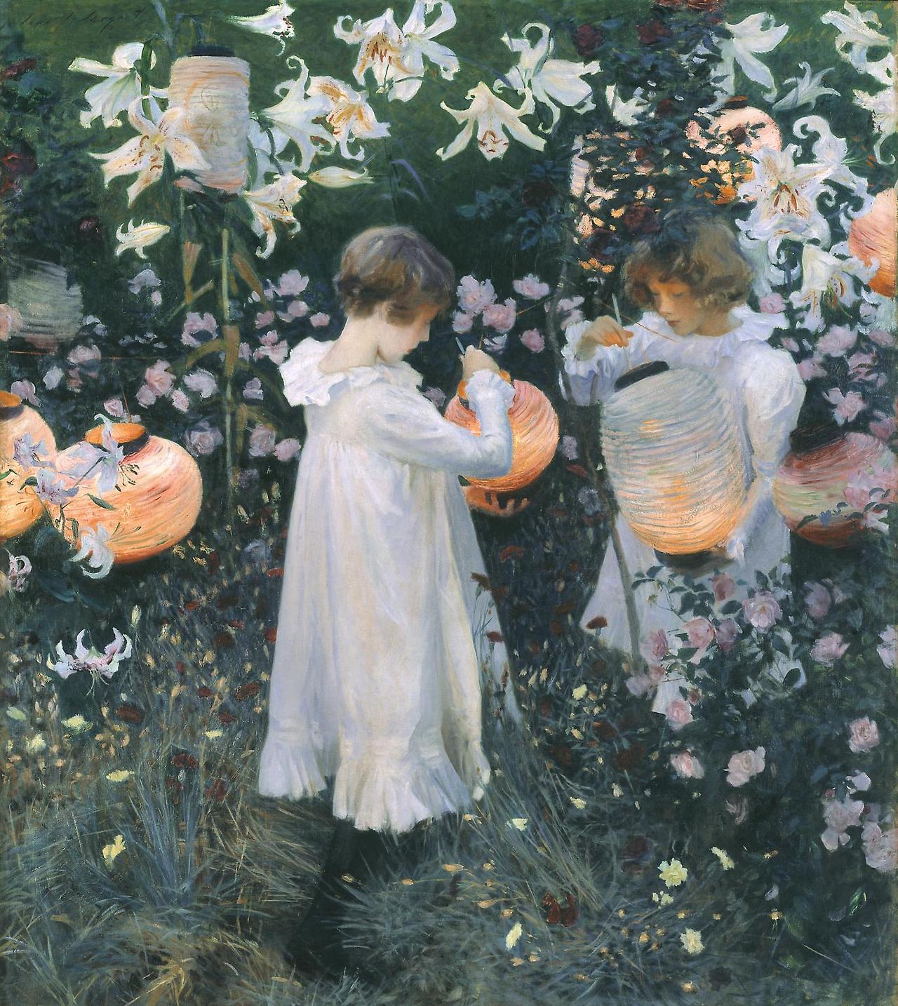 한 번 보면 쉽게 잊기 힘든 그림. 제목마저도 달큼한 <카네이션, 릴리, 릴리, 로즈>가 사전트 인생의 가장 큰 실패 이후에 완성된 그림이라는 사실이 나의 맘 속 깊은 곳을 슬며시 건드린다. 흰 옷을 입은 두 소녀가 해 질 녘 노을이 잔잔하게 비쳐오는 정원에서 등불을 밝히고 있다. 정원에는 흰 백합과 붉은 카네이션, 핑크빛 장미가 흐드러지게 피었다. 사전트가 이 그림을 완성한 것은 1886년 10월경이지만 작업 구상을 시작한 시기는 그보다 빠른 1885년 9월경이다. <마담 X>의 실패로 영국에 도착한 지 얼마 되지 않아 사전트는 새로운 아름다움에 정신을 빼앗긴 것이다. 나무와 백합이 우거진 숲 속, 대롱대롱 매달린 중국식 등불의 고요한 불빛. 우울하면 우울한 것만 보인다. 마음이 기쁨으로 가득 차 있으면 세상 모든 것이 아름답다. 그는 절망 속에서도 아름다움을 볼 줄 아는 독특한 사람이었다. 사전트는 1886년 여름, 본격적으로 그림을 그리기 시작한다.