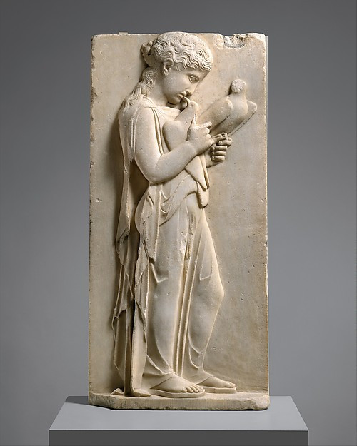 세속적인 무덤 조각. 흥미롭다. 죽음 앞에서도 생을 놓지 못했다고 해야 할까. 죽음 이후에 어디로 갈지 모르기에 지금 놓아버려야 하는 이 생이 너무도 아깝고 아쉽다. 아름다운 소리로 아침을 알려오던 작은 새, 많은 사람들이 모여 함께 음식을 먹고 수다를 떨며 즐거운 시간을 보냈던 연회 때 나를 돋보이게 해주었던 빛나는 장신구, 이제 다시는 볼 수 없고 그 이름조차 불러볼 수 없을 나의 하나뿐인 보물, 나의 소중한 아기. 그리스인들의 무덤 조각에 정성 들여 새겨진 것은 바로 살아있을 때 가장 좋아했던 대상이었다.