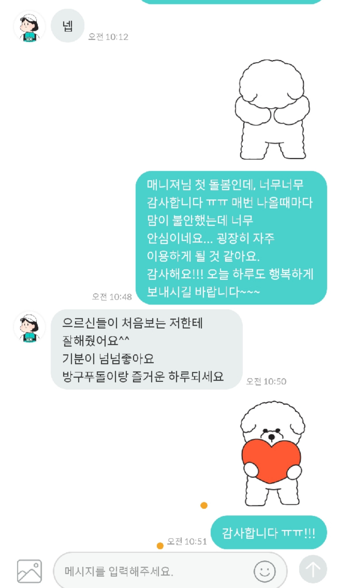 그런데 펫시터분이 오시는 날, 방구가 응아를 한 후 다리가 미끄러져 바닥을 더럽혀놨다. 카메라로 상황을 확인한 아내는 죄송한 마음이 들어 메시지로 정말 정말 죄송하다고 미리 양해를 건넸다. 이에 펫시터분께서는 “에이 괜찮아요~ 저희 집 애들도 맨날 그래요~”라고 답해주셨다. 이런 감동~~!! ㅠㅠㅠ