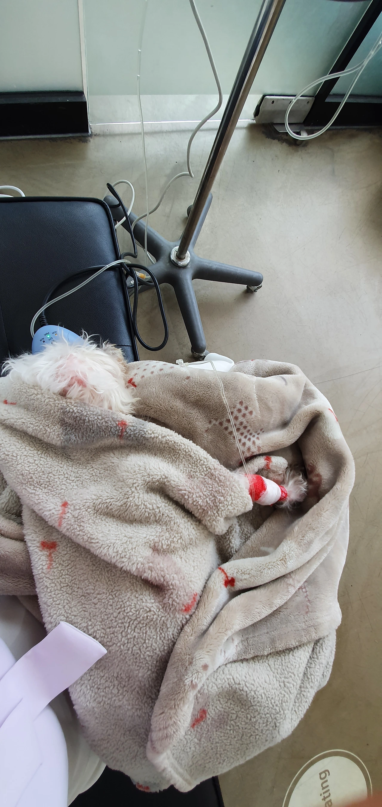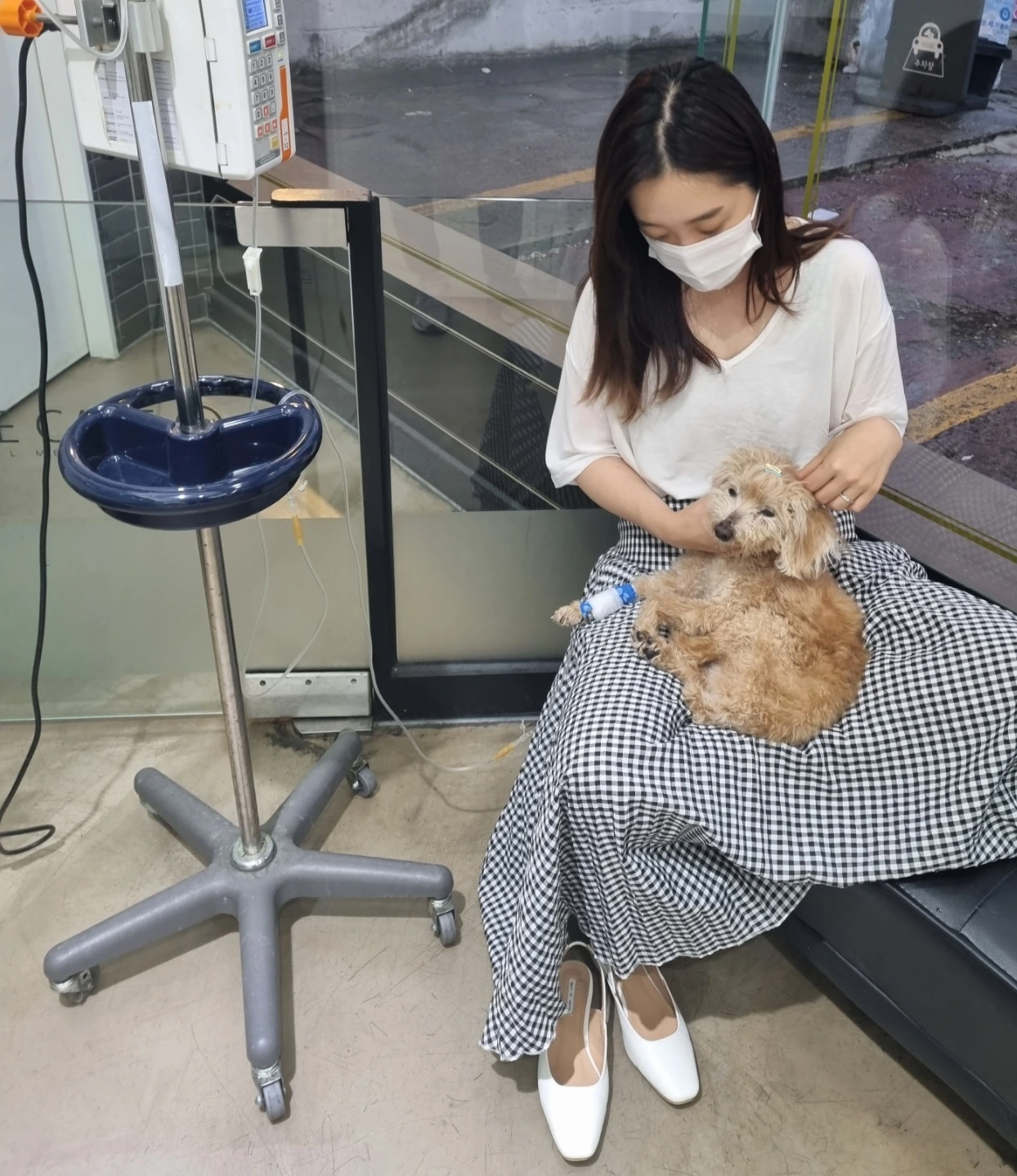 그렇게... 자연스레 아내의 병실 생활도 연장되었습니다. 푸돌이를 안아주었던 그 로비에 이제는 흰색 방구가 앉아있습니다. 아내 품에서 곤히 자고 있는 방구... 푸돌이와 마찬가지로 수액의 방울이 천천히 들어갑니다. 며칠 전에 이 모습 그대로 보았던 것 같은데... 아내 품에 안겨 있는 녀석만 바뀌었습니다.
