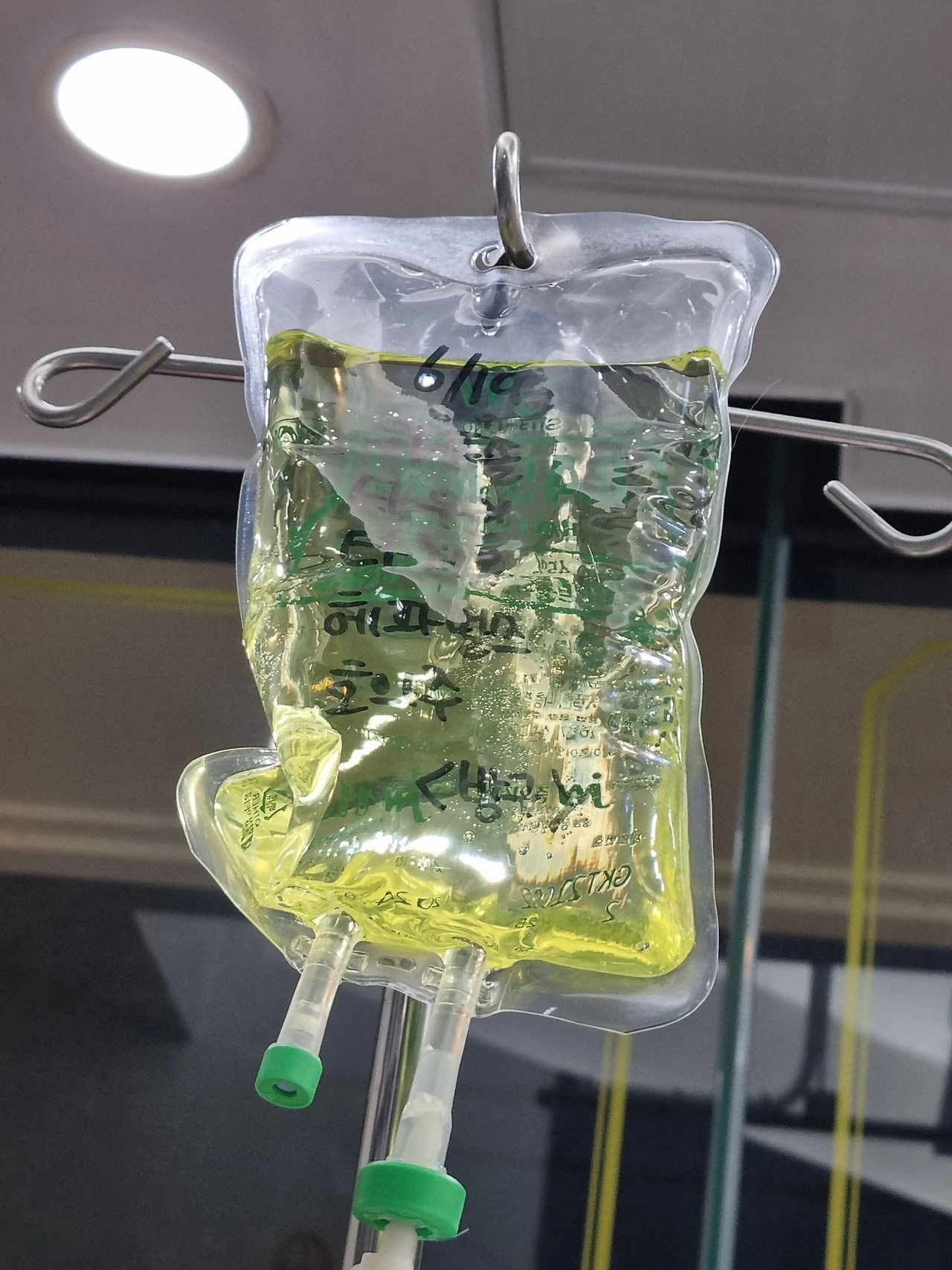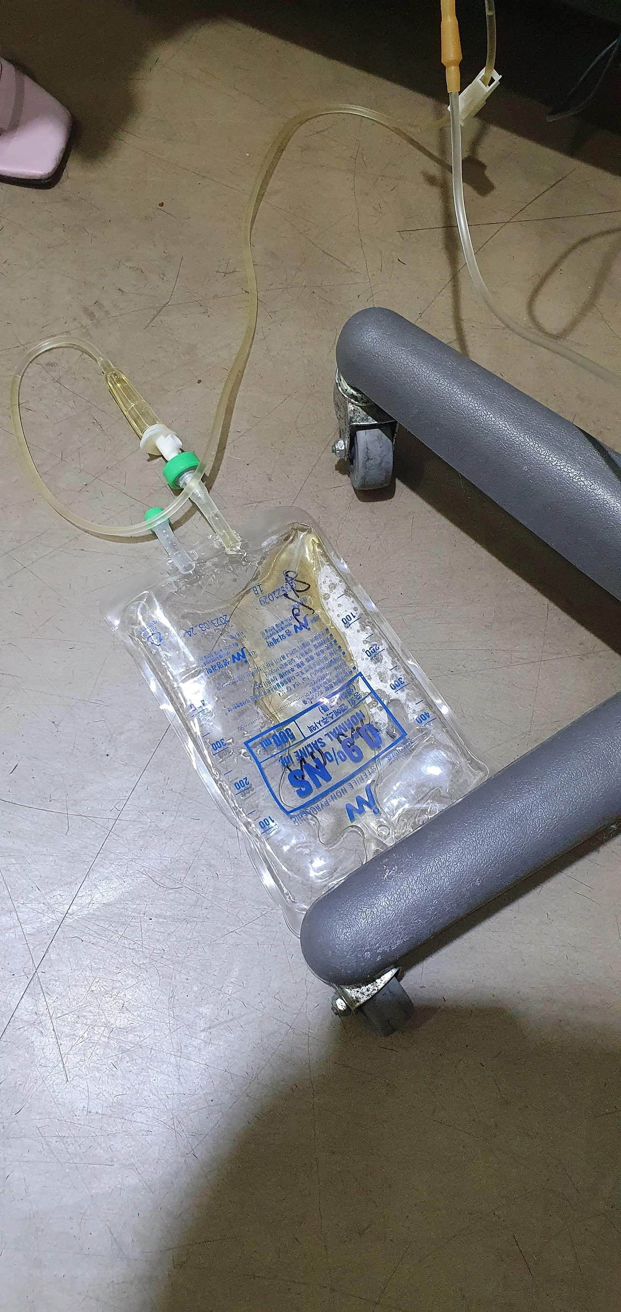 회복을 위한 수액(왼쪽) , 소변줄과 연결해 방광의 소변을 빼고 있는 모습 (오른쪽)