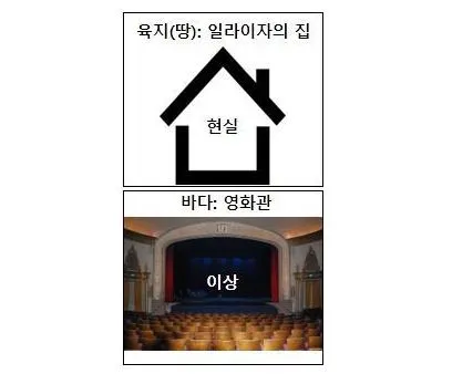 또 한가지 흥미로운 점은 기본적인 배경공간을 현실과 이상으로 나눈 흔적이 보인다는 것이다. 일라이자의 집은 2층에 있고 그 아래에는 영화관이 있다. 마치 육지와 바다(혹은 강)처럼 구도 설정이 되어있는데, 이는 각각 현실과 이상세계를 대비시켜 드러낸다.