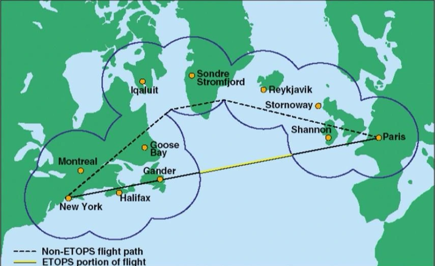 1950년대에 만들어진 규칙에 발전한 제트 여객기들이 규제받는 것은 불합리했다. 이에 까다로운 몇 가지 조건을 통과한 쌍발 항공기들에 특별한 인증을 주어 공항으로부터 더 먼 곳까지 비행을 허가해주게 되었는데, 이 제도가 ETOPS(Extended Twin-engine Operational Performance Standards)다. 매우 긴 이름이지만, 엔진 두 개 항공기도 멀리 날 수 있게 해주겠다는 뜻이다.