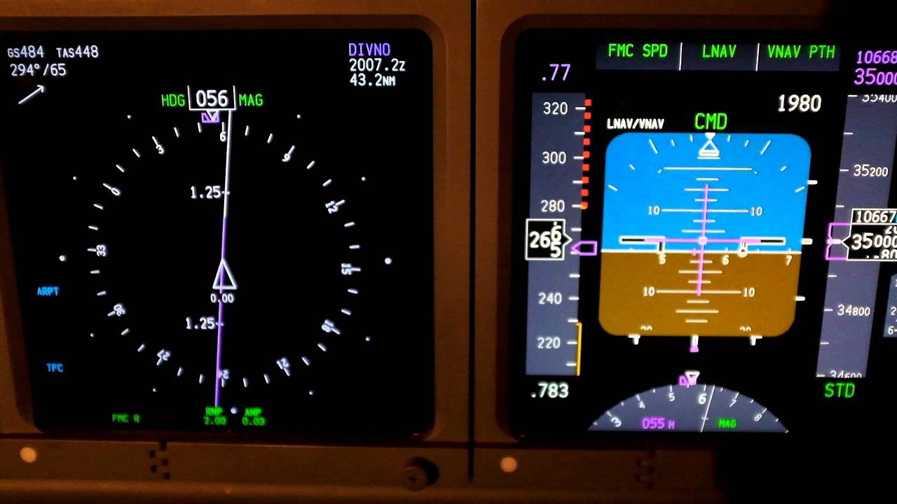 바람을 가르는 속도인 진대기속도(TAS)는 448노트지만 바람이 왼쪽 뒤에서 약 60노트로 불고 있다. 뒷바람이므로 비행기가 실제로 지상을 지나가는 속도는 진대기속도보다 빠를 것임을 짐작할 수 있는데, 실제로 화면에 표시되고 있는 지상 속도 GS는 484노트 (시속 900km/h)로 TAS보다 빠른 것을 볼 수 있다. 한편, 주계기판 왼쪽에 표시되고 있는 인지 속도는 혼자 생뚱맞게 265노트 (시속 490km/h)를 표시하고 있다. 객실에서는 시속 900km의 속도를 보지만, 비행기는 고작 500km/h의 속도를 인지하고 있는 상황인 것이다.