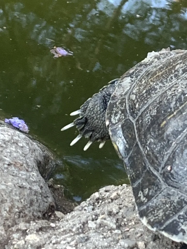 날카로운 발톱 좀 보세요~! 물에 떠 있는 보라색 꽃은 벌새도 좋아하는데 거북이가 꽃을 먹더라구요! 꽃 먹는 거북이 ㅎㅎㅎ 거북이가 잡식이지만 왠지 거무튀튀한 녹색과 등치를 보니 물고기만 잡아먹을 것 같은데 꽃을 먹으니 의아했어요. 채식 거북이는 아니겠죠?