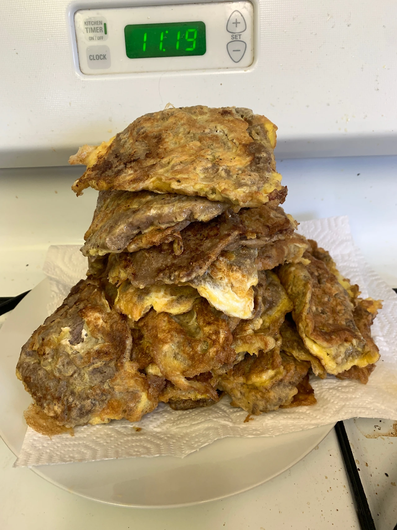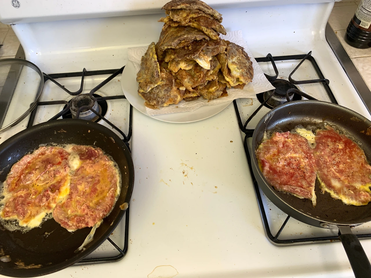 고기에 소금, 후추를 뿌리고 해동될 동안 부침가루, 달걀물을 차례로 세팅합니다. 차례로 고기를 담그고 후라이팬에 올리면 끝이에요! 얇아서 금방 구워져요. 다만 굽는 동안 애들이 왔다갔다하며 상당히 많이 먹어버립니다 ㅋㅋ