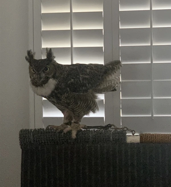 30여 년 전 동물병원에서 구조된 수리 부엉이가 있다는 연락을 받으셨고 사냥할 수 없게 된 부엉이를 집에서 돌보기 시작했습니다. 야생에 살면 수명이 약 7년 정도에 불과한데 올해 부엉이 새미(Sammy)는 서른 살이 됐습니다.